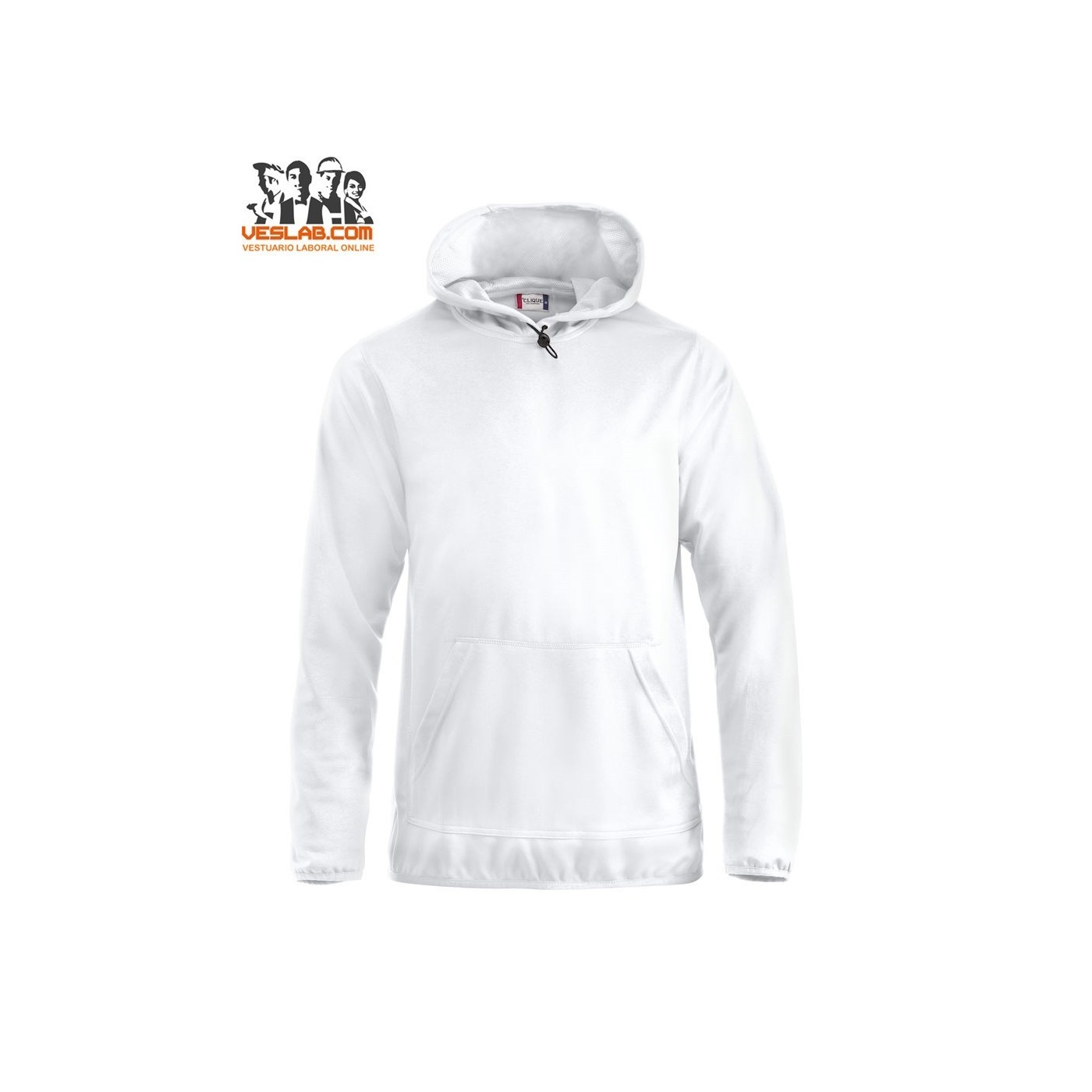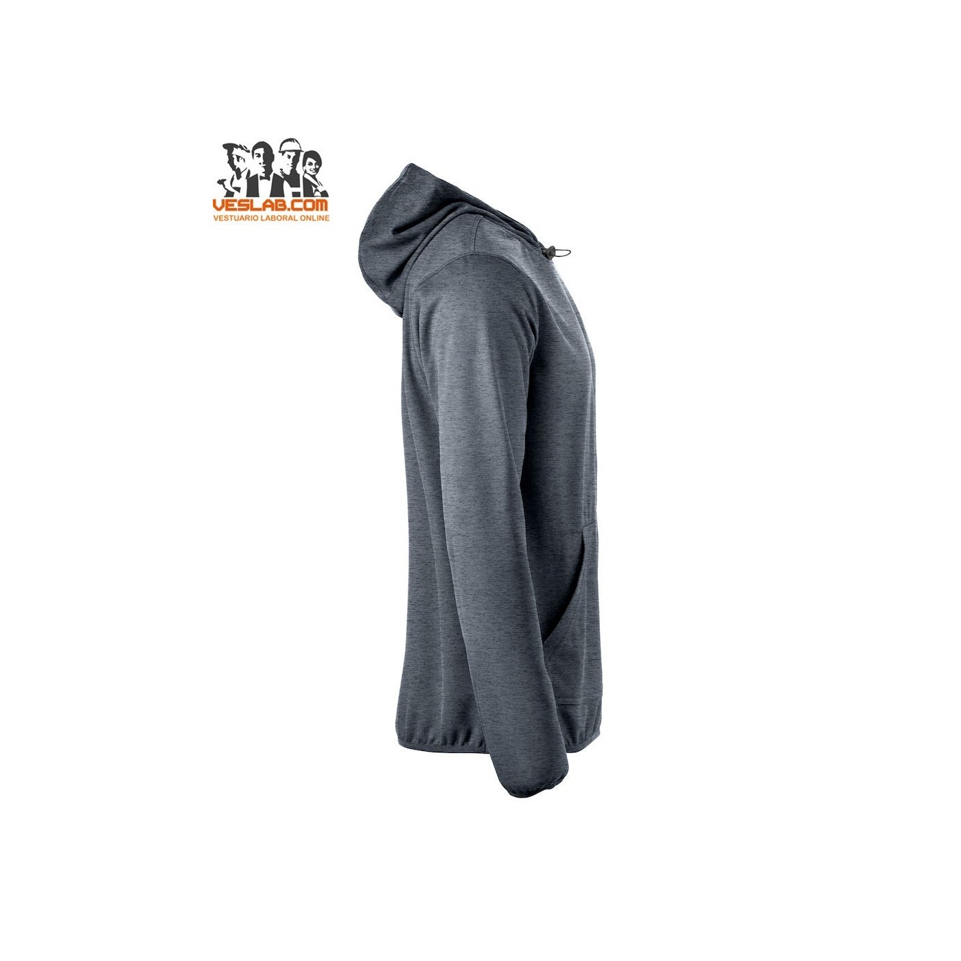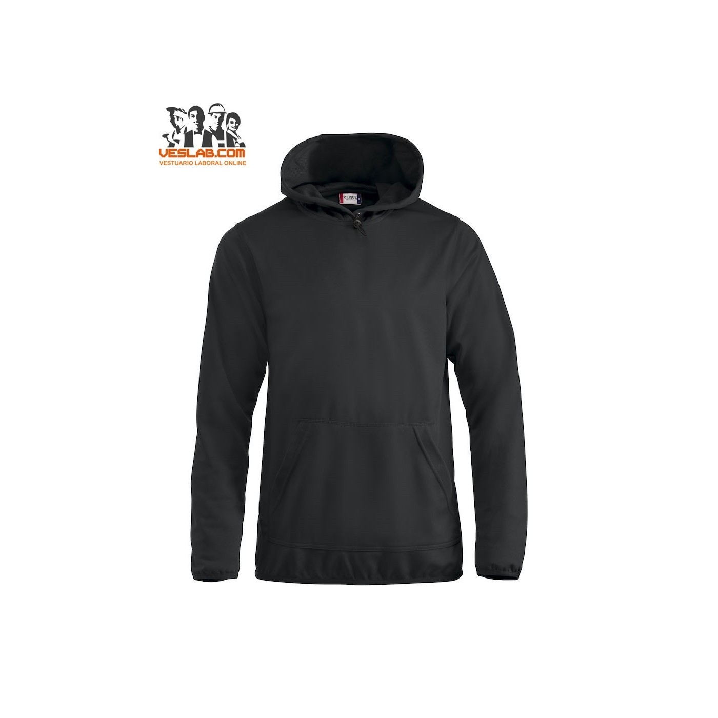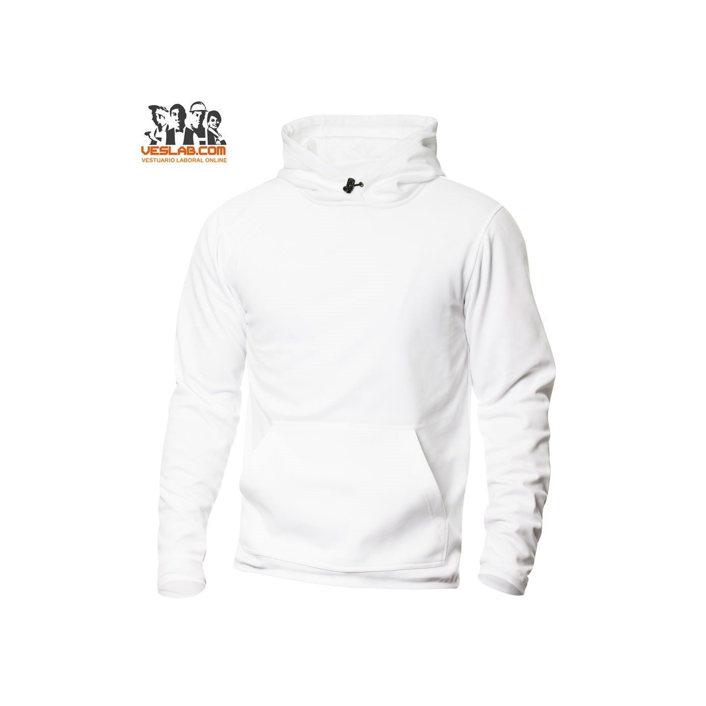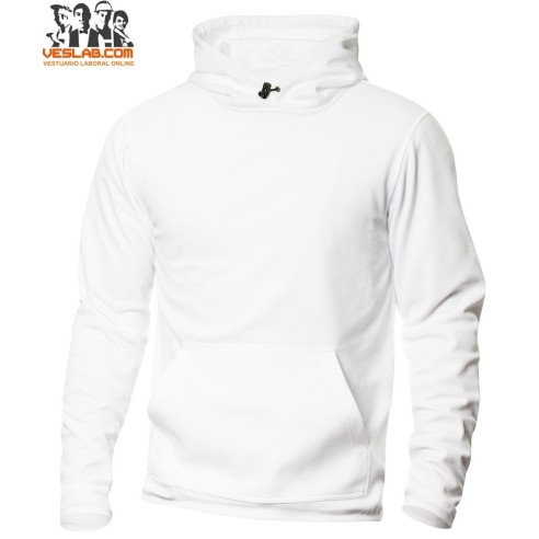 Dessuadora esportiva transpirable amb caputxa i butxaca frontal. Vora elàstic en cintura i punys. Costures remalladas i folre interior en caputxa.