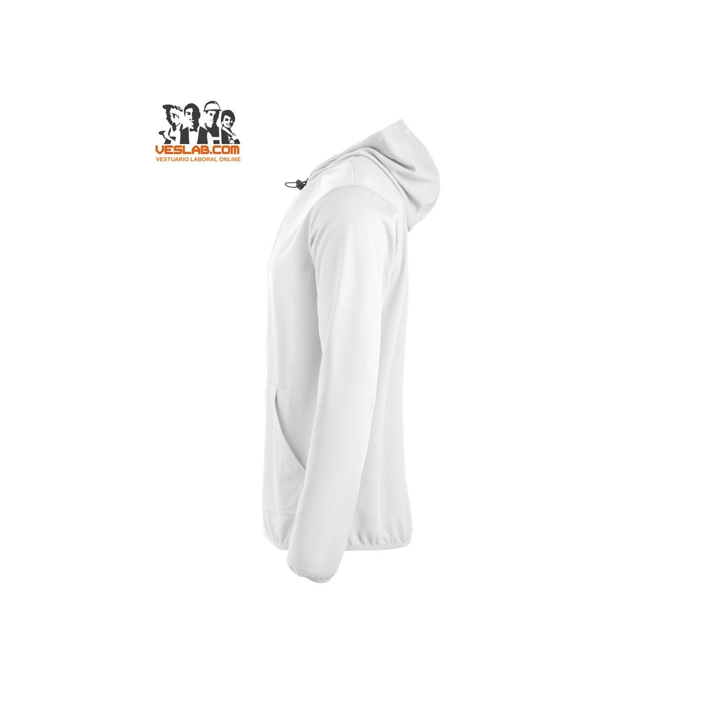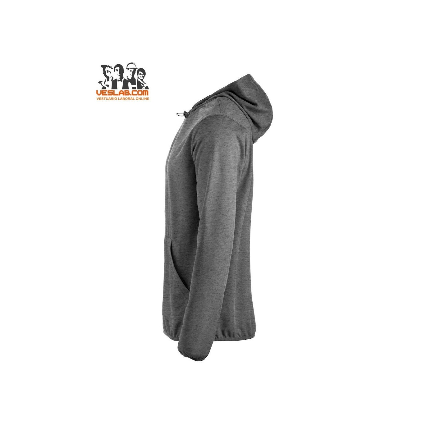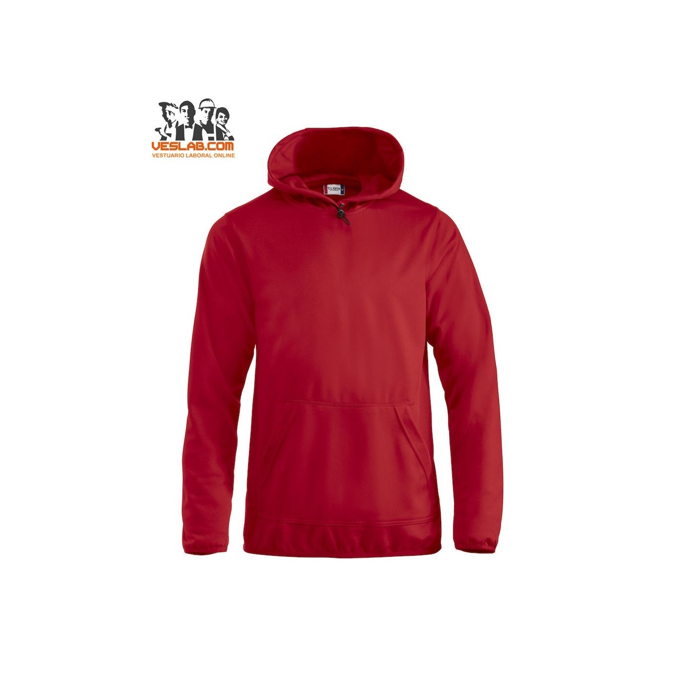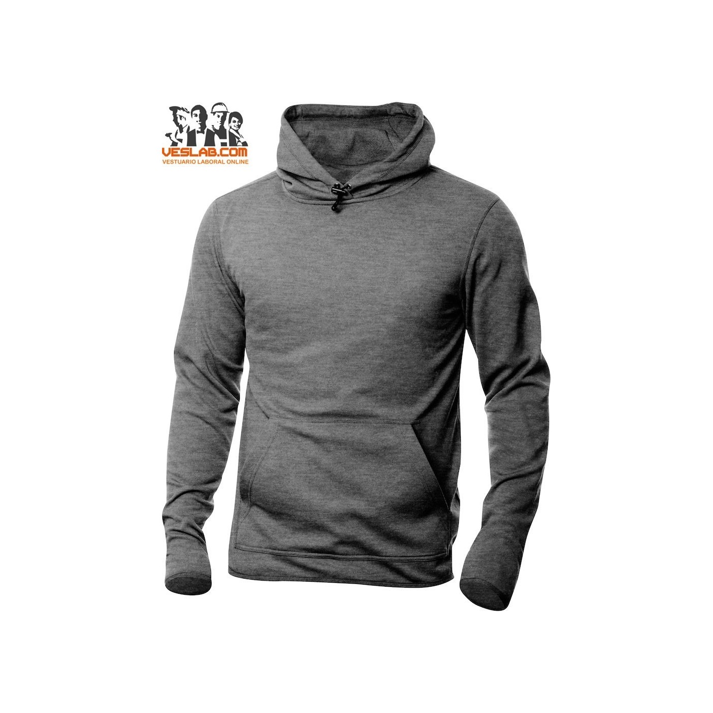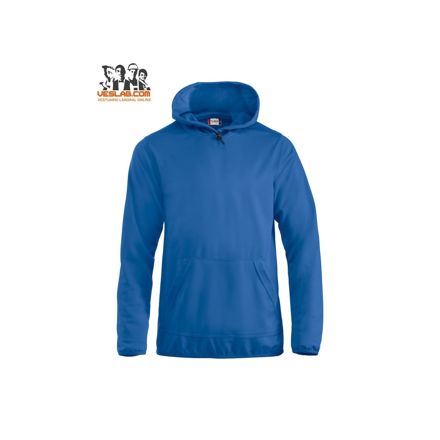 Dessuadora esportiva transpirable amb caputxa i butxaca frontal. Vora elàstic en cintura i punys. Costures remalladas i folre interior en caputxa.