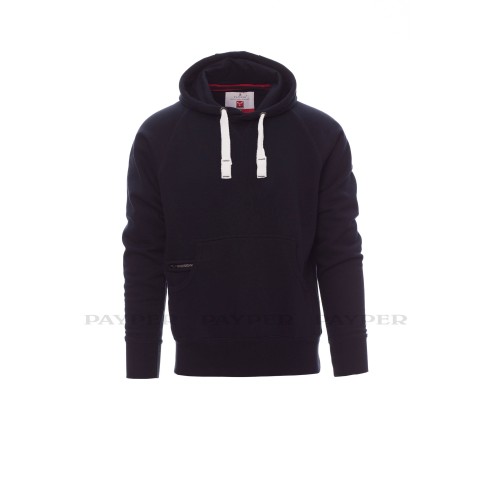 Es tracta d'una moderna dessuadora per a home amb caputxa amb doble costura i una amplada cordó blanc amb puntades i cèrcols metàl·lics de contrast. Molt recomanable per a qui vulgui donar una imatge corporativa moderna i esportiva.