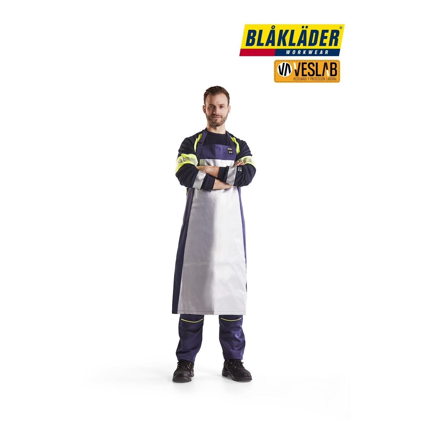 Davantal per a soldadors amb tela reforçada especial i molt resistent repel·lent de l'metall fos. Protegeix de l'ferro, de l'zinc i de l'alumini i es pot sotmetre a rentat industrial, segons normativa EN ISO 15797 indicades en les etiquetes exteriors. Disposa d'un cinturó per lligam.