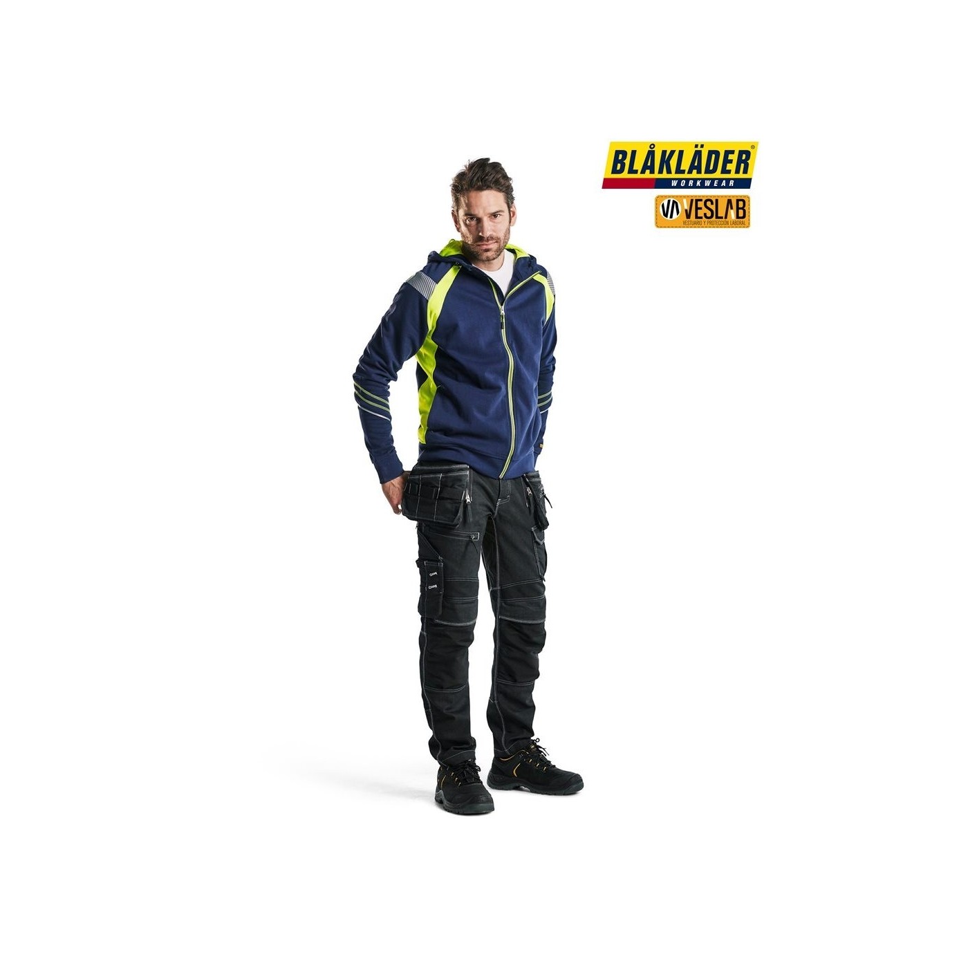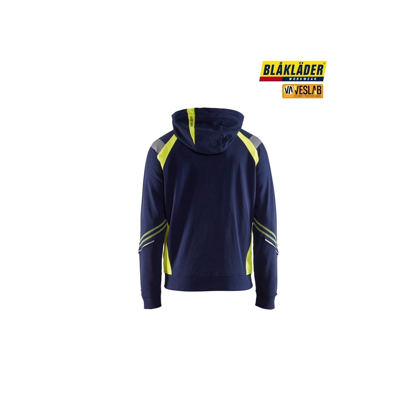 Dessuadora amb caputxa suau molt còmoda confeccionada en cotó. Té panells i detalls reflectants d'alta visibilitat per a major visibilitat, vora a la part inferior i en les mànigues i butxaca interior per al telèfon amb cremallera. L'àrea fosca de l'suèter consisteix en 100% cotó i l'àrea d'alta visibilitat en 100% polièster.