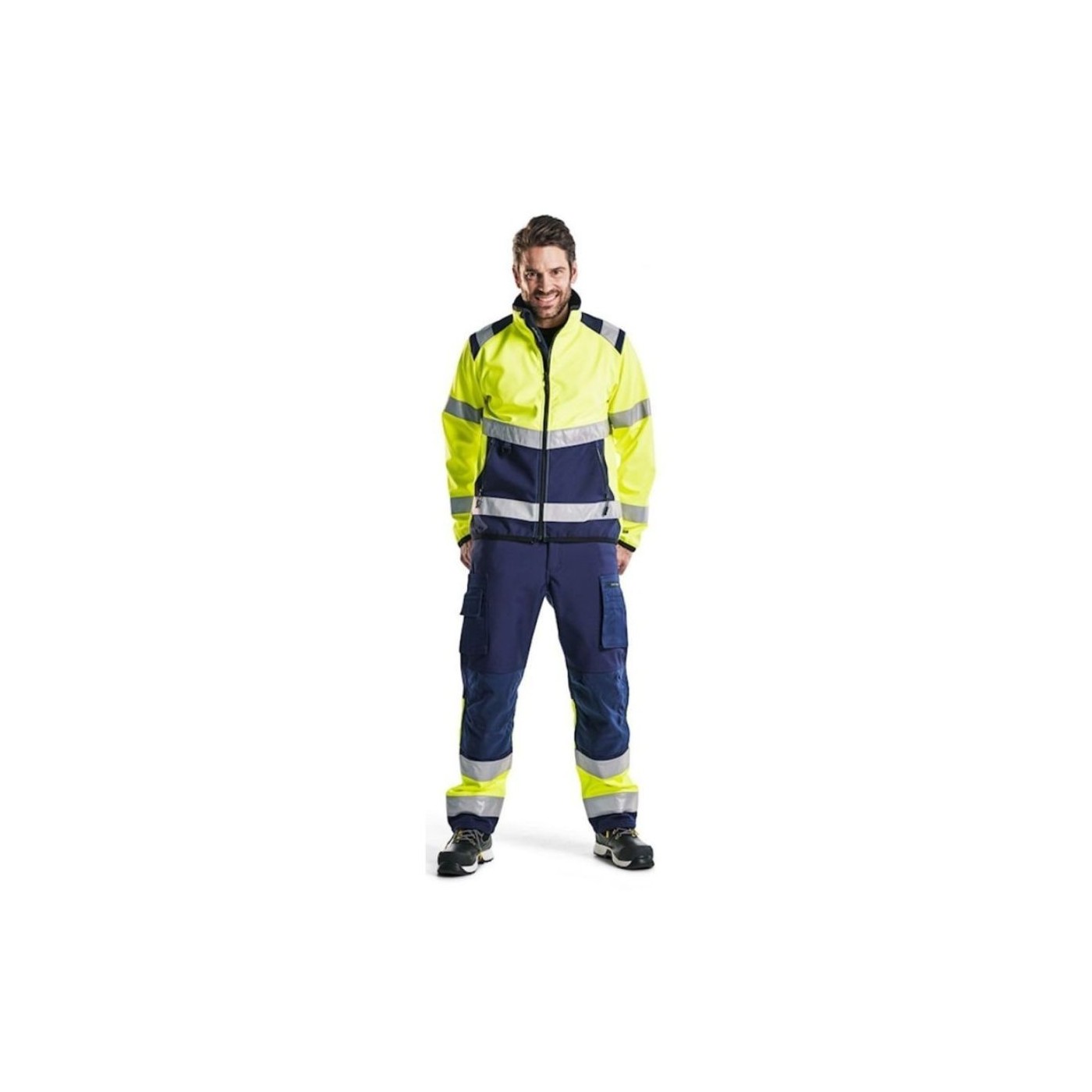 Pantalons de treball elàstic, transpirable que protegeix de el vent i la pluja. Els pantalons són adequats per al sector de l'transport i compten amb dues butxaques a les cames, un amb butxaca per ganivet i un altre amb cremallera. Reforç Cordura a genolls per màxima durabilitat. Certificat segons EN ISO 20471 classe 1.