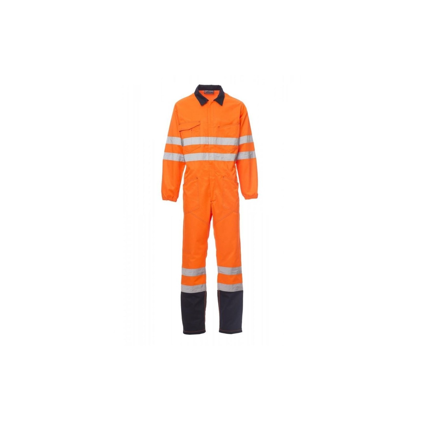 Granota d'alta visibilitat amb bandes reflectants, cremallera central coberta de doble cursor, elàstic a la cintura a la part posterior. Triple costura de reforç a l'entrecuix ia la part interior de la cama. Dues àmplies butxaques a l'alçada del pit, una amb tapeta i ganxo per a identificació personal, un suport per a bolígrafs, una butxaca del darrere amb tapeta, suport per a metre lateral dret. Punys amb elàstics.