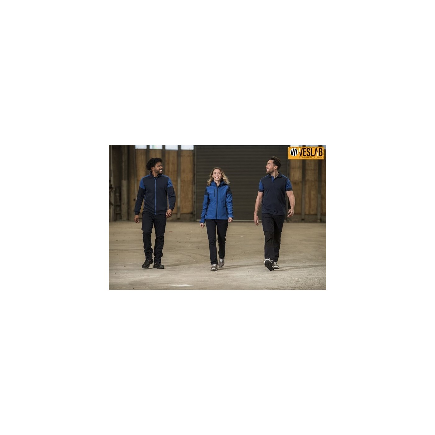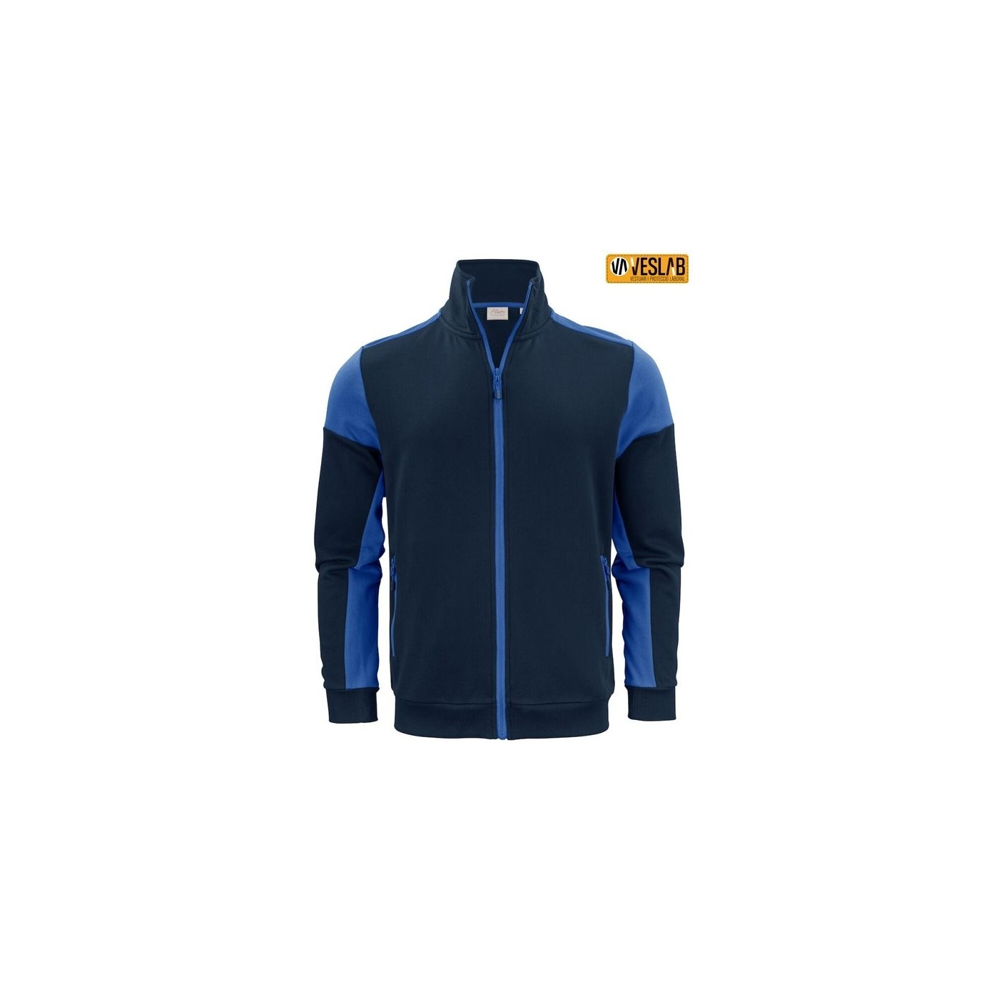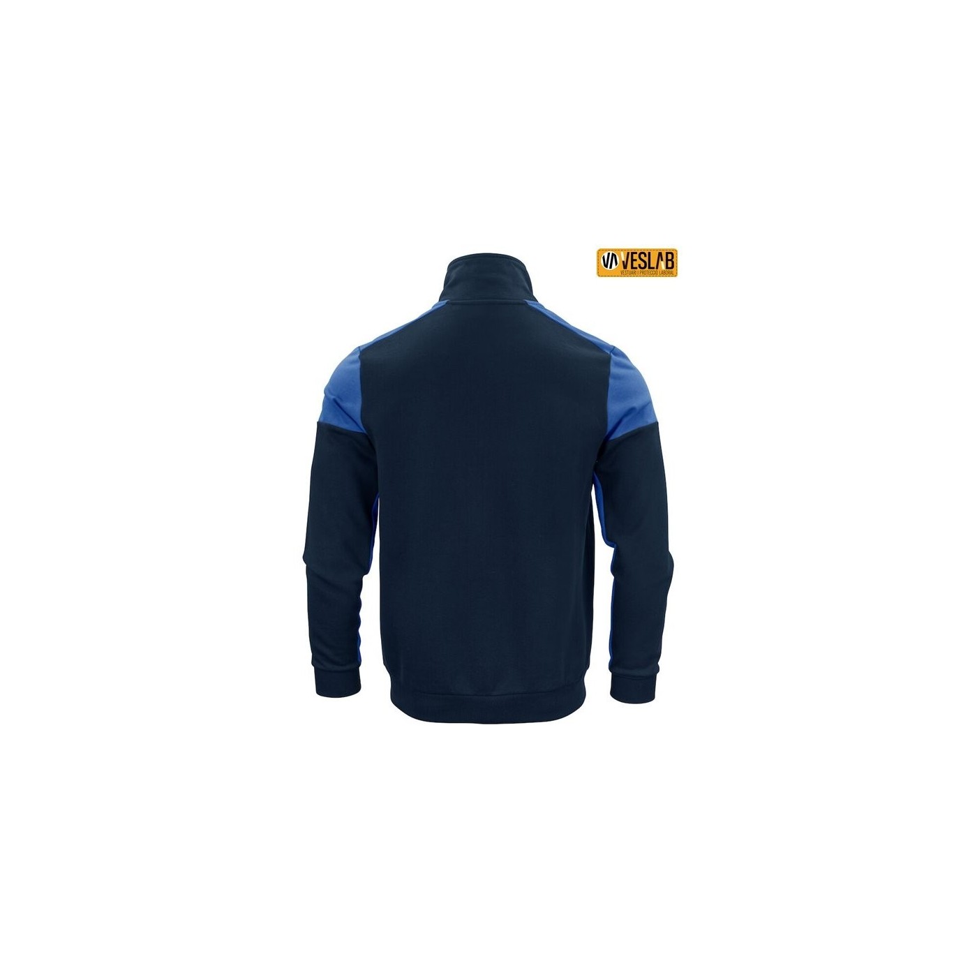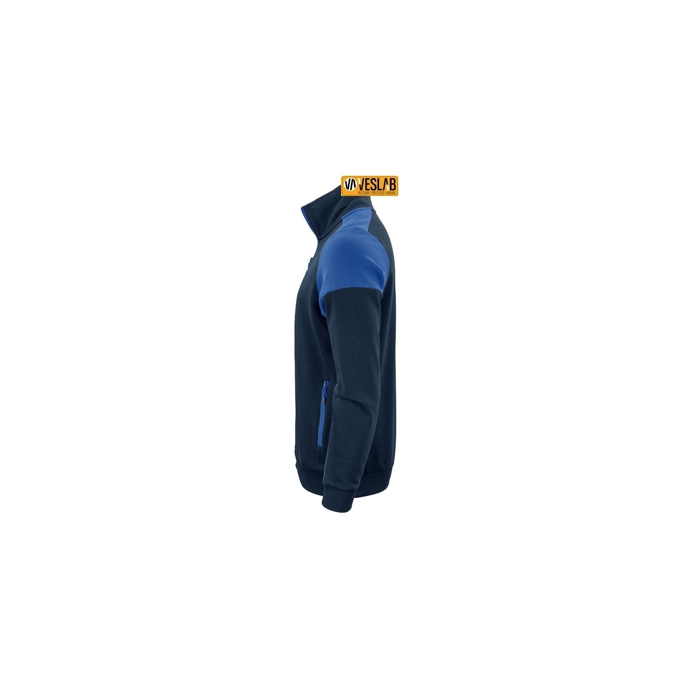 Presentem una elegant i funcional jaqueta de treball d'estil dessuadora, amb un disseny bicolor que ressalta gràcies a la cremallera en contrast a la part frontal i les butxaques davanteres. A més, compta amb una cinta que aporta un toc addicional al coll i detalls de canalé 2x2 a les mànigues i la vora inferior.