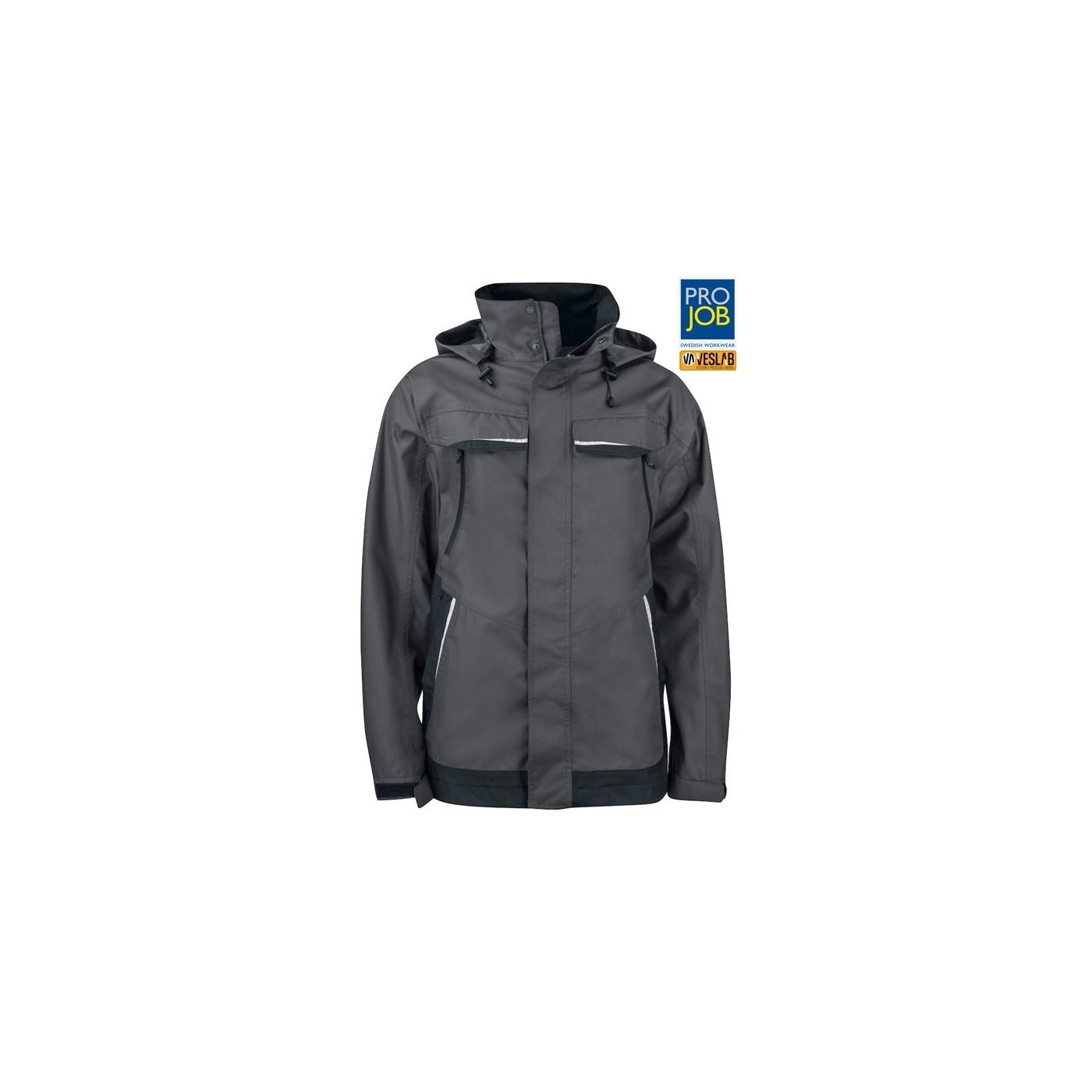 Jaqueta de treball Projob amb encoixinat resistent al vent ia l'aigua, amb costures segellades per a més durabilitat. Disposa d´una cremallera frontal amb solapa que evita la penetració d´aigua, tancament a pressió per a més seguretat. Compte amb butxaques dobles a la part frontal: dues amb solapa i tancament de Velcro, i dues amb cremalleres resistents a l'aigua. La part esquerra està especialment dissenyada per portar targeta identificativa. A més, té butxaques laterals amb cremallera i folre polar. Al seu interior, compta amb tres butxaques espaioses, dues amb cremallera. La caputxa és ajustable i desmuntable mitjançant cordó. Els punys són ajustables amb Velcro i la cintura es pot ajustar mitjançant cordó. El folre s'obre fàcilment, cosa que facilita la personalització mitjançant brodat o qualsevol tipus d'impressió.