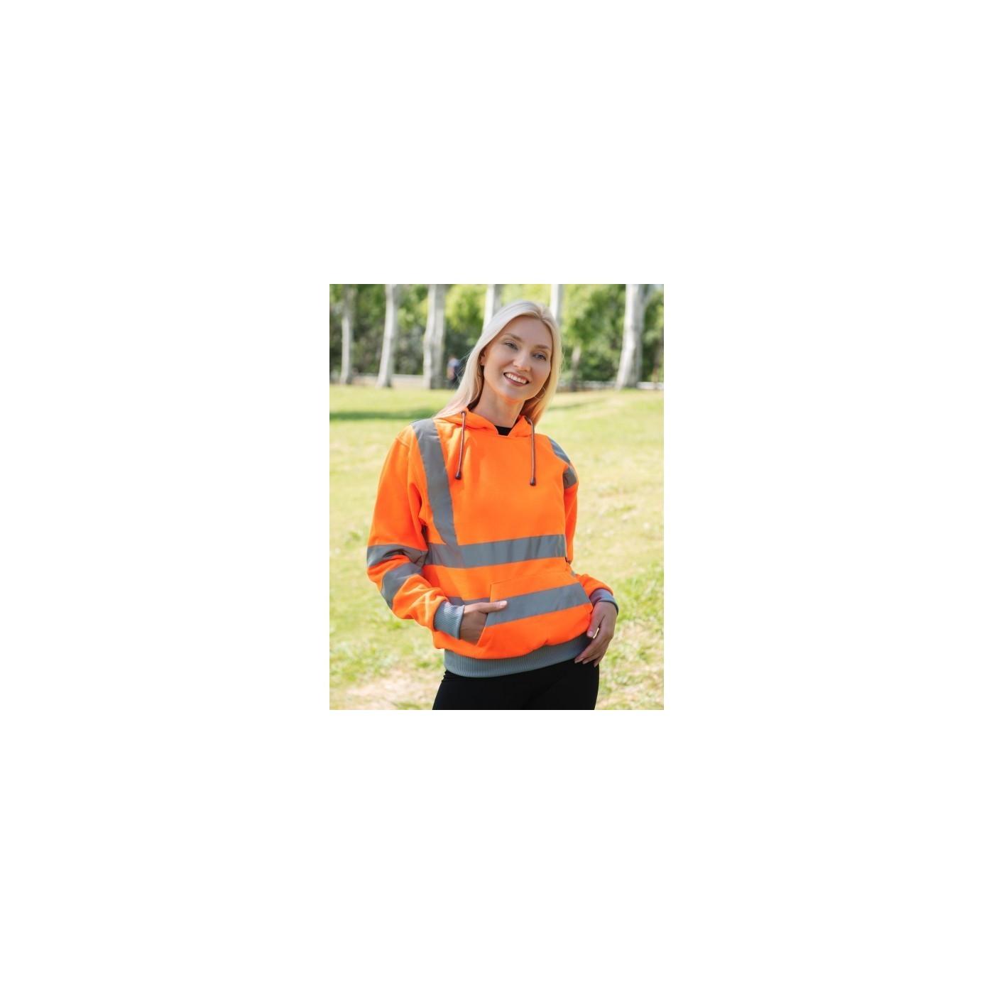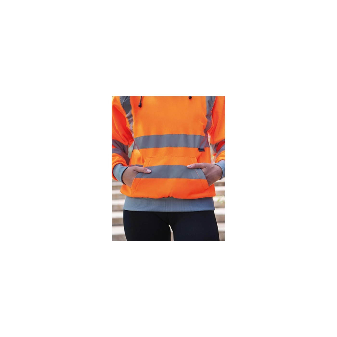 Descobreix la nostra exclusiva dessuadora amb caputxa d'alta visibilitat, confeccionades amb un 100% de polièster per oferir-te la màxima durabilitat i comoditat. Aquestes dessuadores compten amb una moderna caputxa equipada amb cordons grisos, una pràctica butxaca cangur i detalls distintius com punys i baix de canalé gris en contrast.