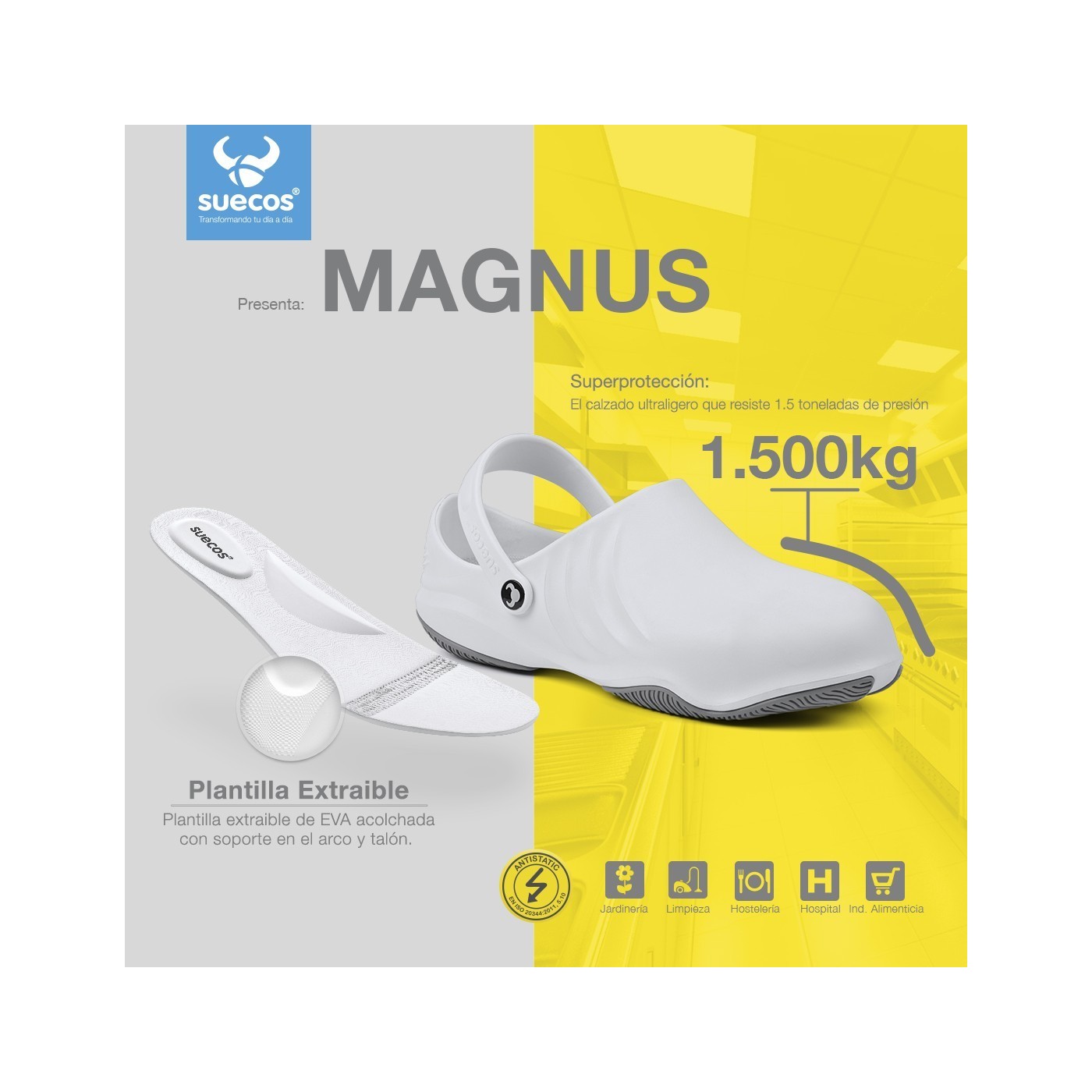Magnus és el nou model de Suecos® que dóna un pas més en proporcionar seguretat i un gran confort. Aquesta sabata antiestàtic fet a força d'EVA és capaç de resistir a 1.500 kg de pressió, gràcies a la seva puntera reforçada.