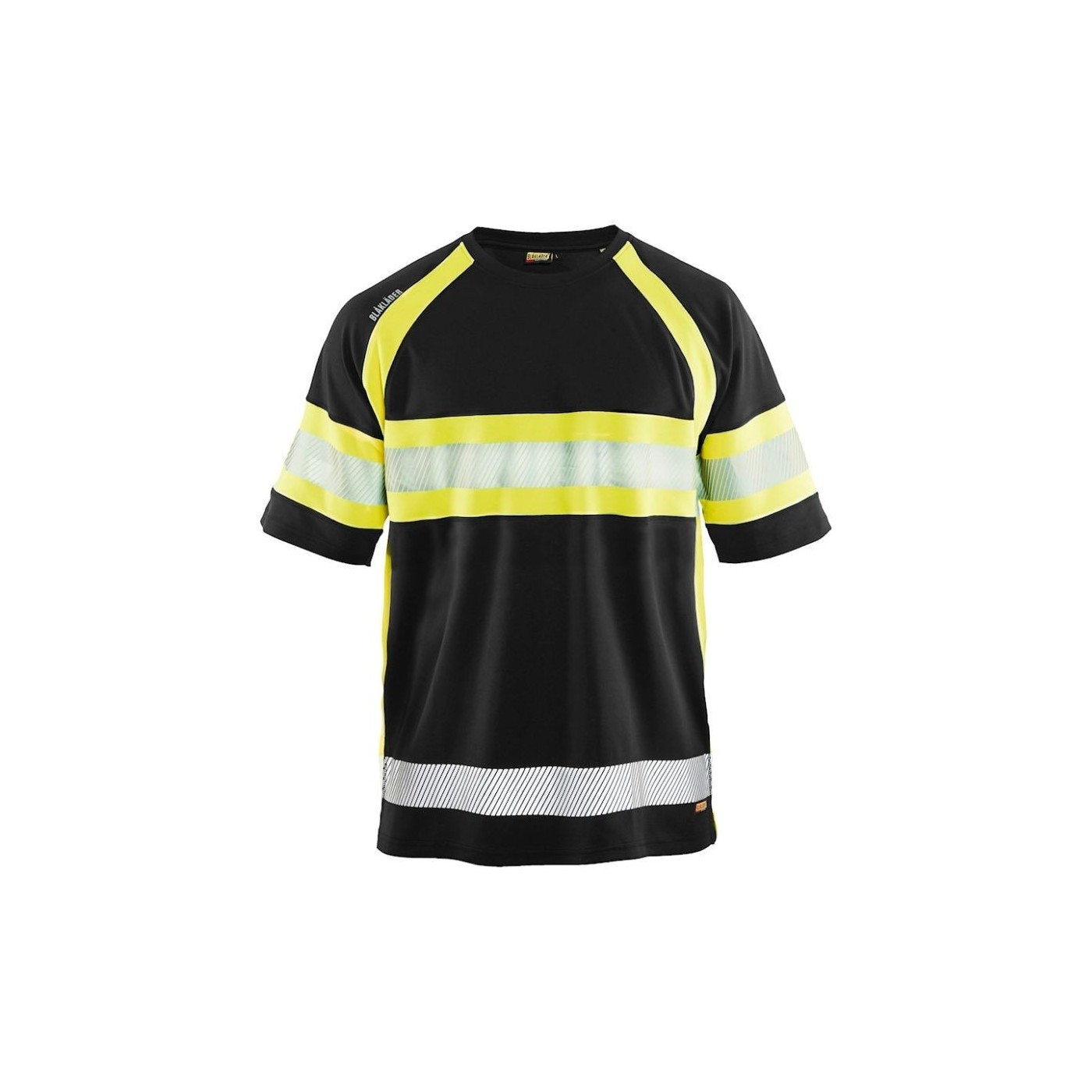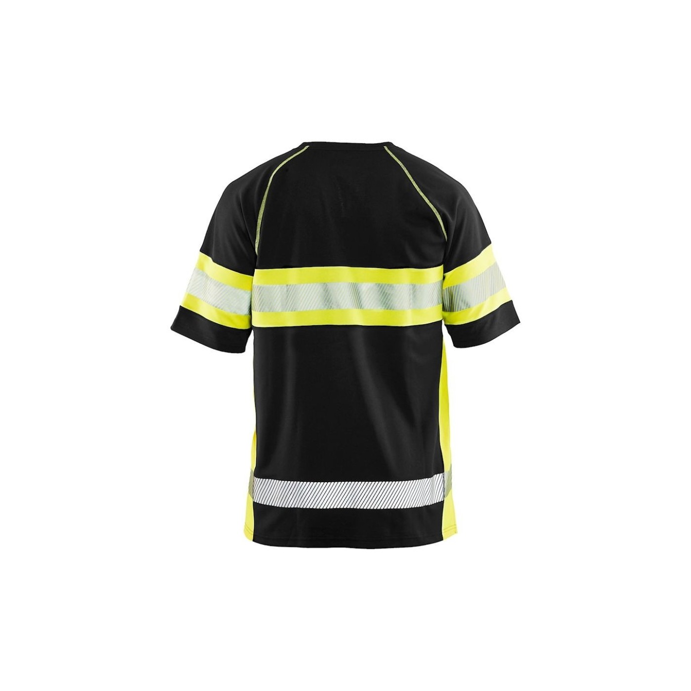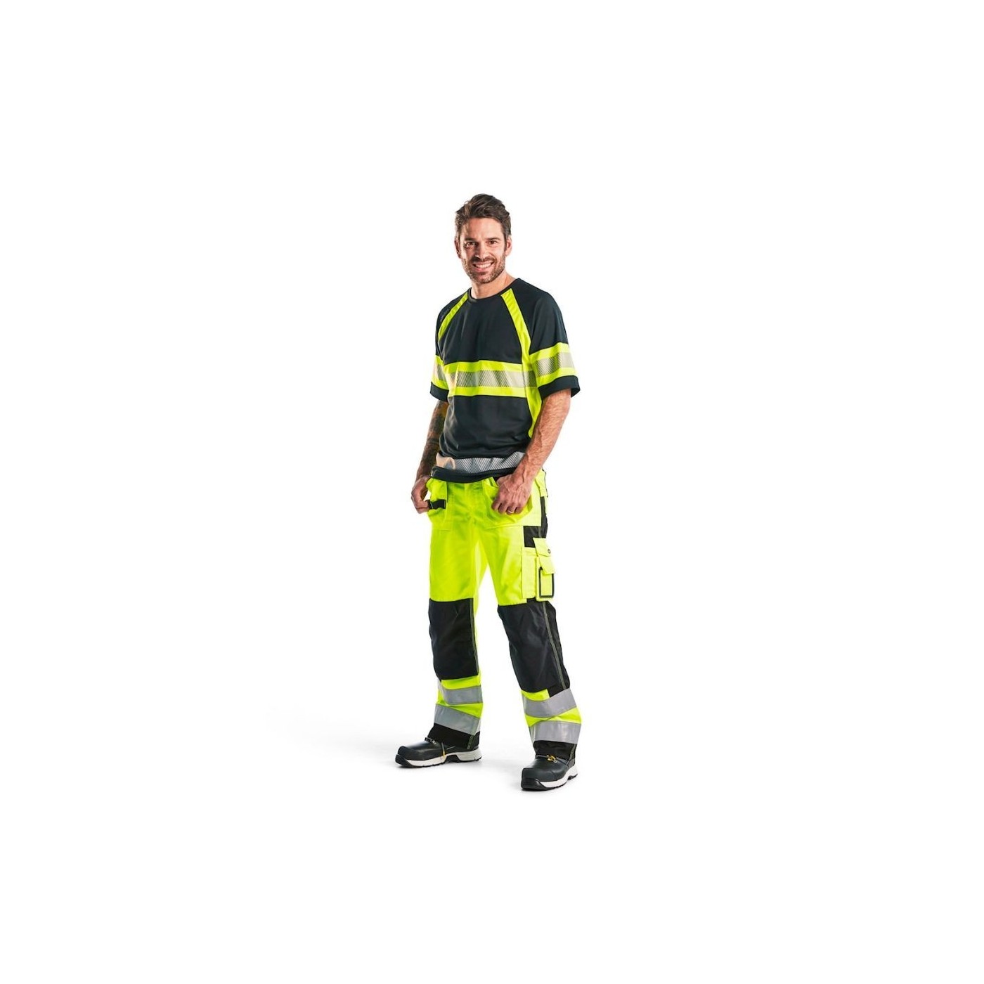 Samarreta d'alta visibilitat bicolor Blaklader amb tractament antiolor per prevenir les males olors. La samarreta dissipa la humitat i disposa a més de protecció UV. Té barres reflectants estampades, la qual cosa li confereix més elasticitat i permeabilitat a l'aire. Coll rodó amb costures reforçades.