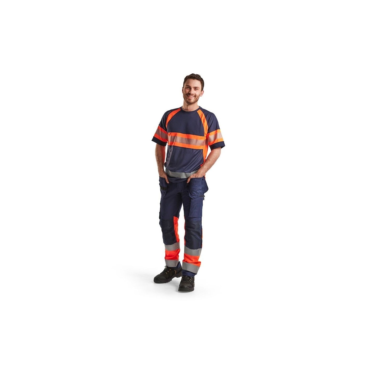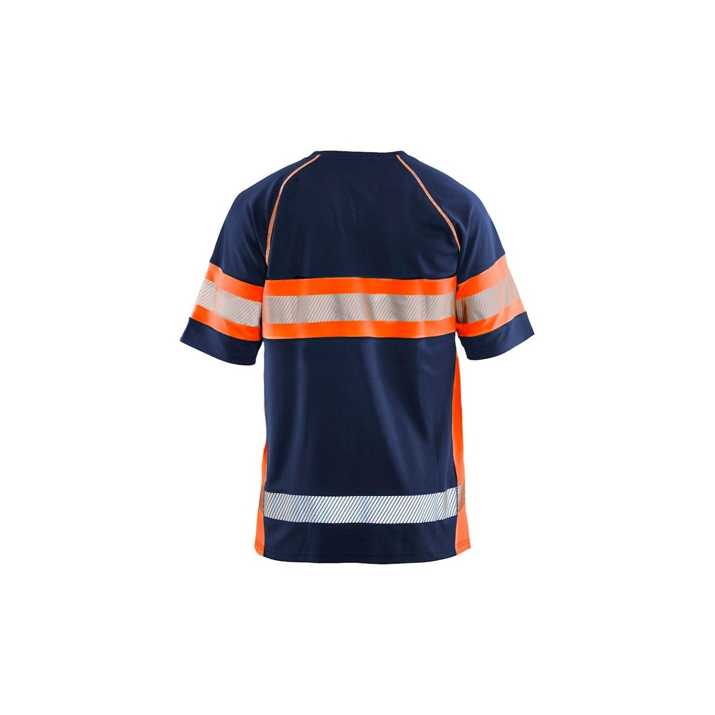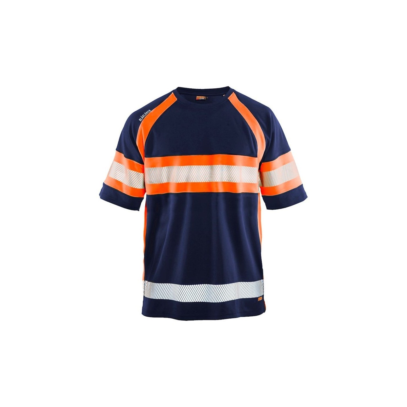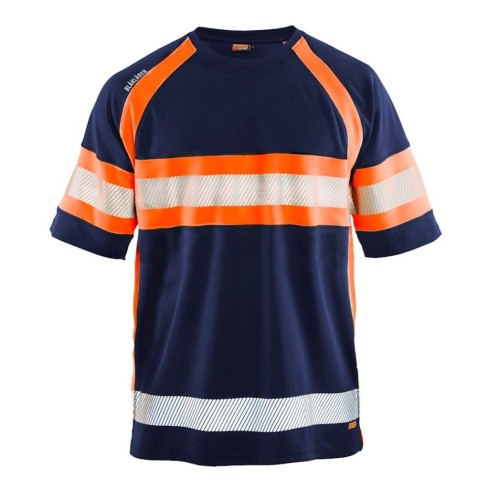 Samarreta d'alta visibilitat bicolor Blaklader amb tractament antiolor per prevenir les males olors. La samarreta dissipa la humitat i disposa a més de protecció UV. Té barres reflectants estampades, la qual cosa li confereix més elasticitat i permeabilitat a l'aire. Coll rodó amb costures reforçades.