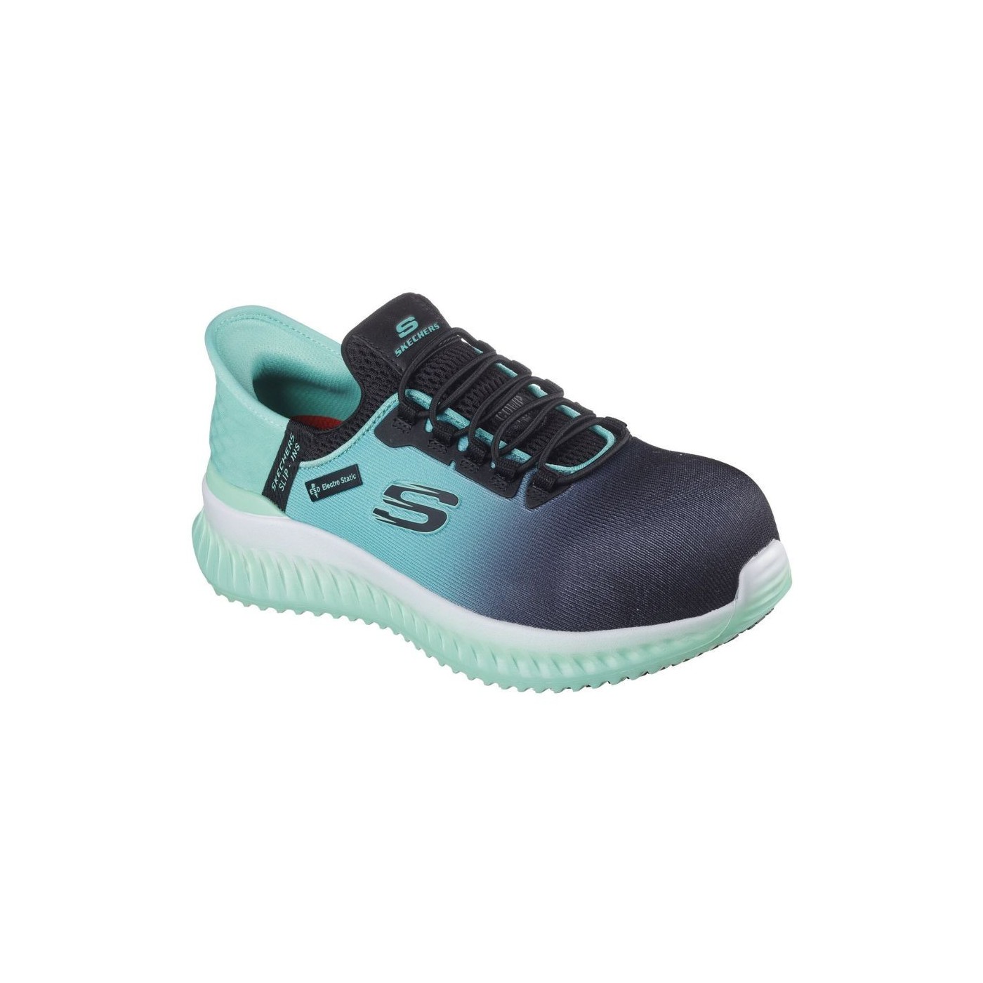 El calçat de seguretat Skechers Work™ Slip-ins® Tilido per a dona combina comoditat i protecció amb la seva tecnologia Hands Free Slip-ins®, plantilla Air-Cooled Memory Foam® i puntera de seguretat composta. La seva sola antilliscant i protecció contra riscos elèctrics les fan ideals per a jornades exigents.