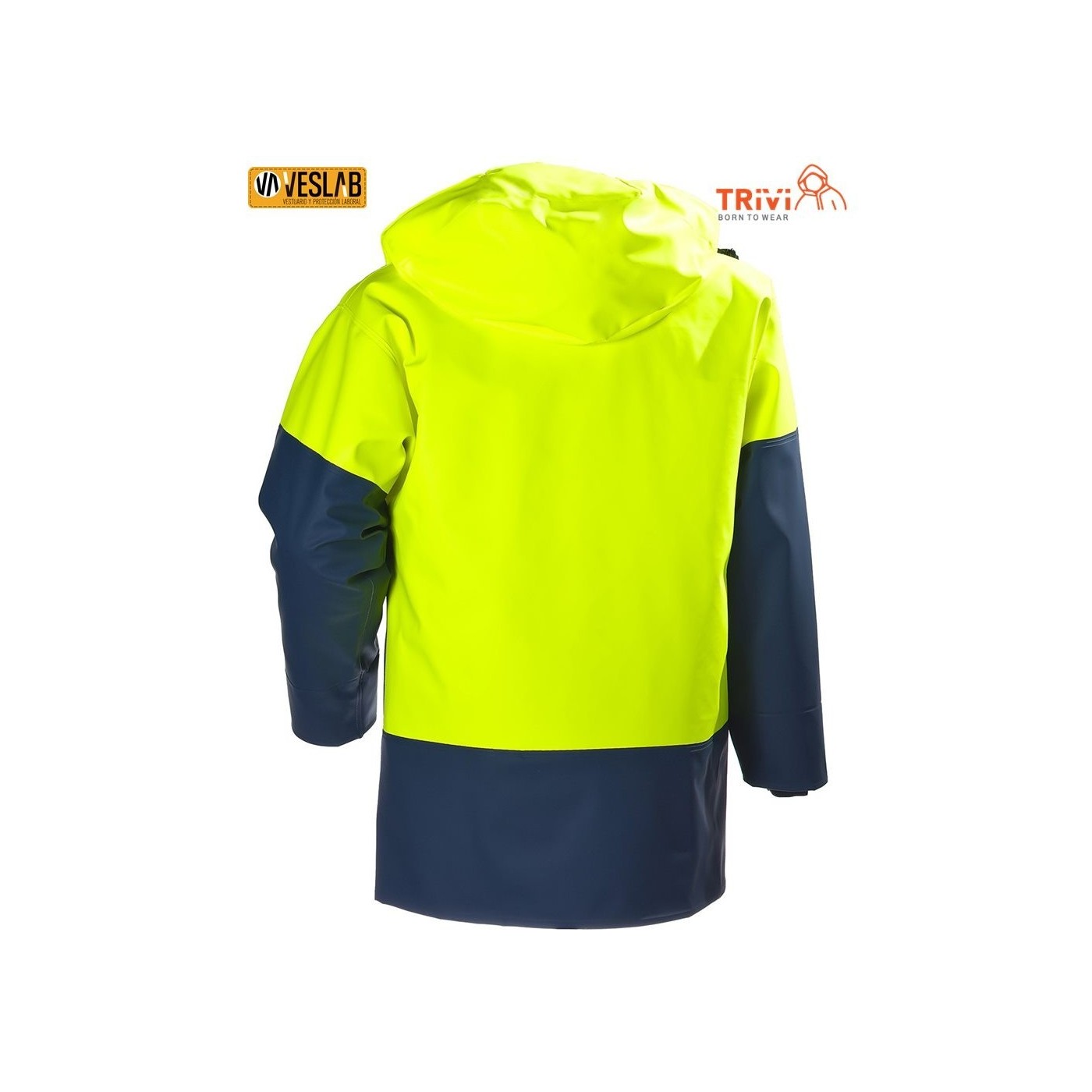 Jaqueta bicolor de pesca en alta mar tancada amb tancament frontal en terç superior mitjançant manxa interior i solapa que tanca al seu torn amb cinta de contacte.