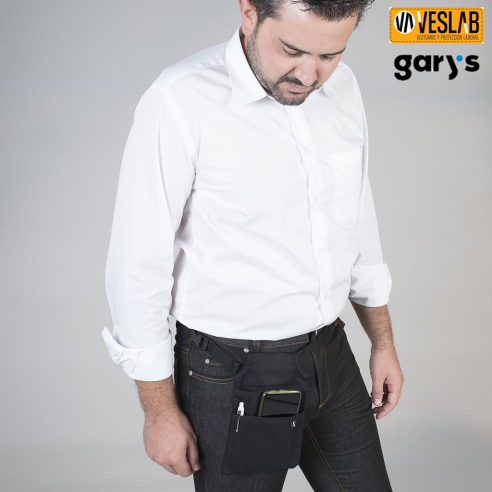 Funda per a PDA confeccionada en 4 tons diferents de vaquer. Compta amb petita butxaca per a bolígraf i obridor. Disposa de cinturó regulable. Té unes mides de 23cm x 16cm. Peça molt pràctica i còmoda per completar l'uniforme de cambrers a bars, restaurants, cafeteries, terrasses i altres negocis d'hostaleria i restauració.