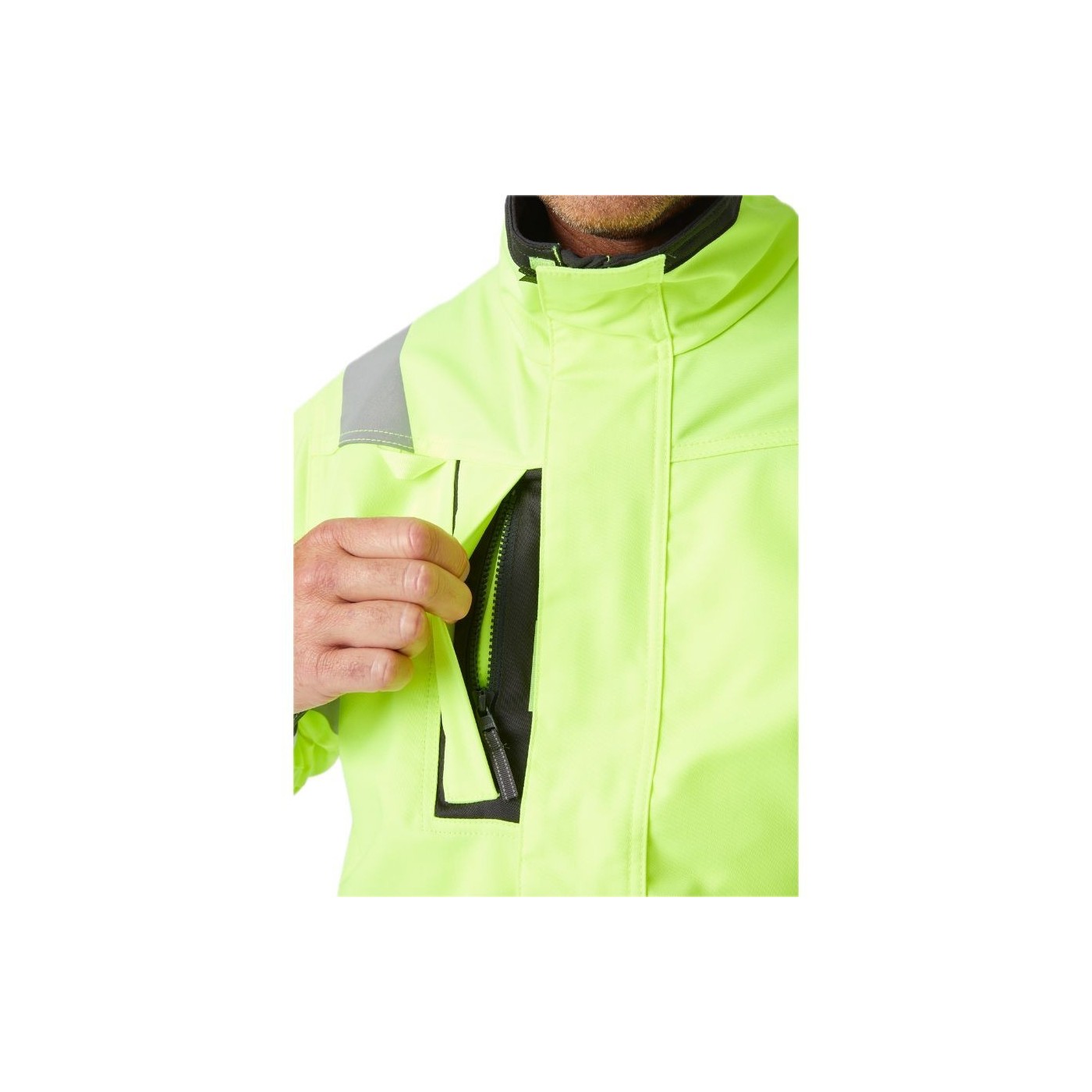 La chaqueta Helly Hansen Alna es un producto de alto rendimiento con alta visibilidad de clase 3 y la protección más alta posible (EN 343 3.3) contra la penetración de agua y la resistencia al vapor de agua, lo que significa compatibilidad entre la protección contra los elementos y la transpirabilidad. Capucha desmontable y cremalleras de ventilación para controlar la temperatura.
