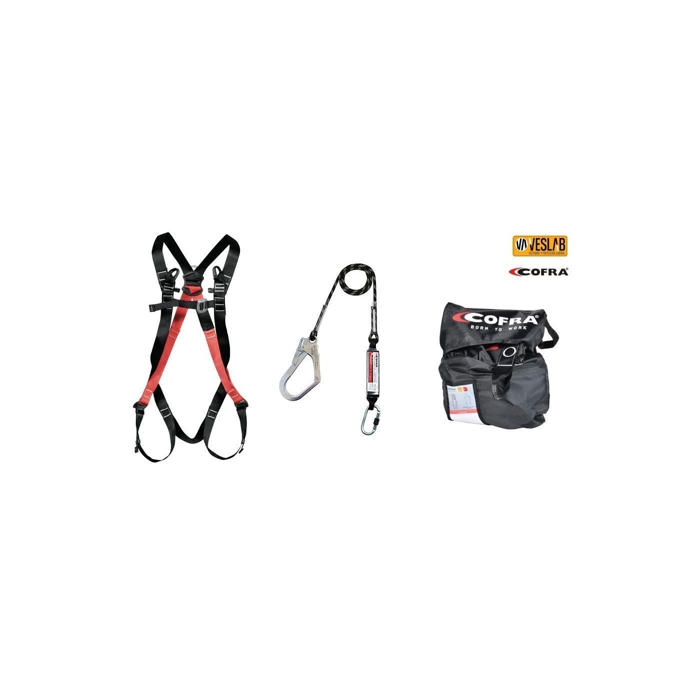 Kit que consta de un arnés, un retráctil con absorbedor, una correa de anclaje y dos conectores.