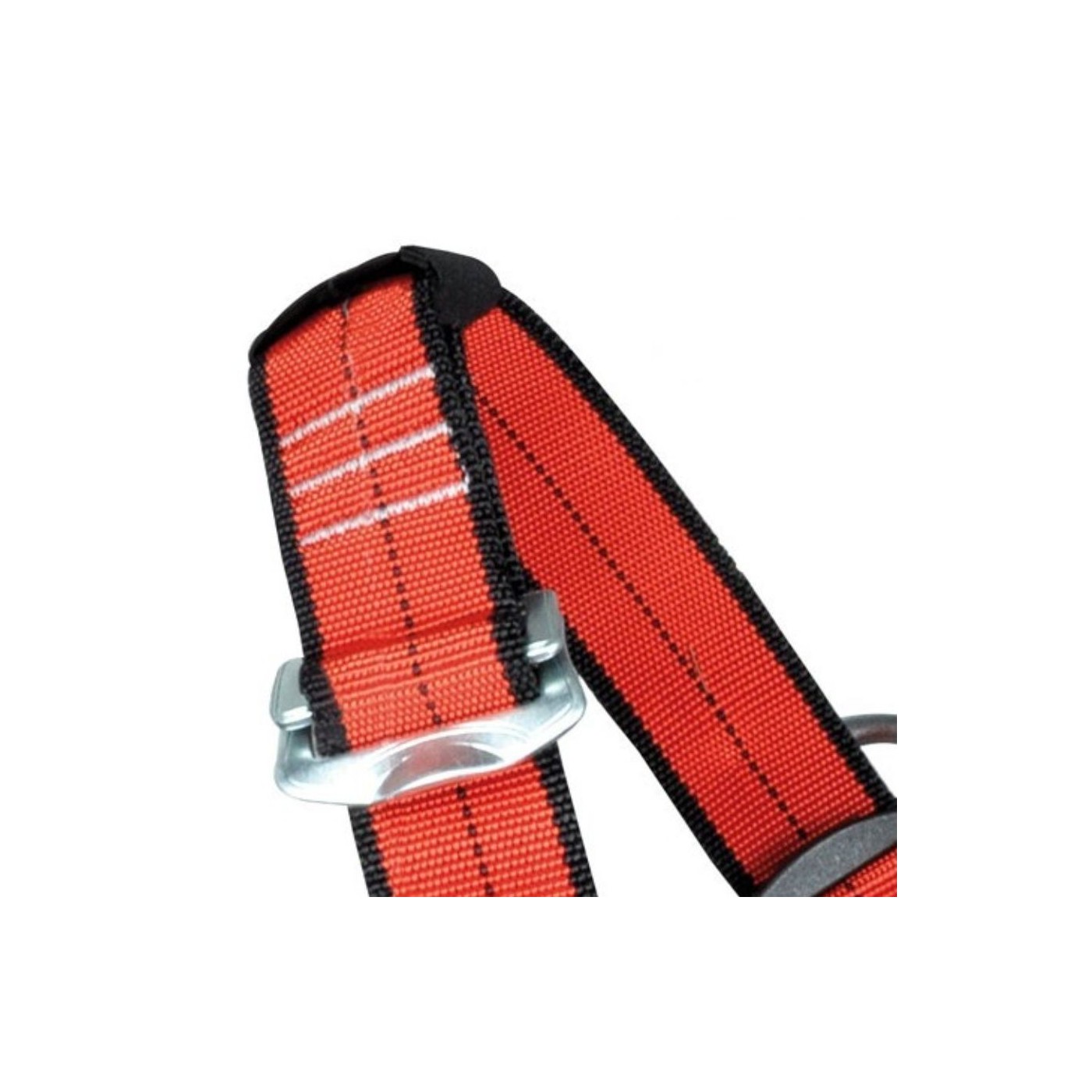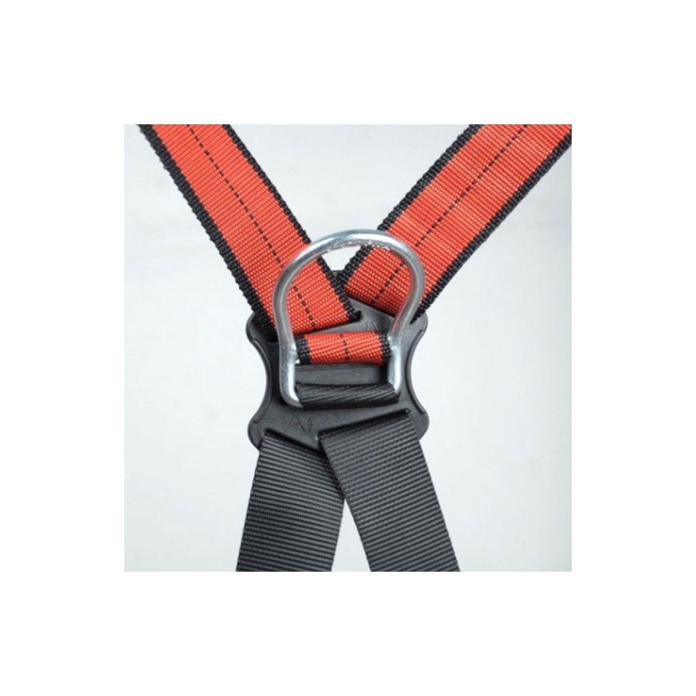 Los puntos de conexión incluyen un D-Ring de acero galvanizado en la zona dorsal y dos bucles A/2 de correas de poliéster en la zona esternal. La regulación se logra mediante dos hebillas de acero galvanizado en los tirantes, una hebilla de acero galvanizado en la zona esternal y dos hebillas de acero galvanizado en las perneras.