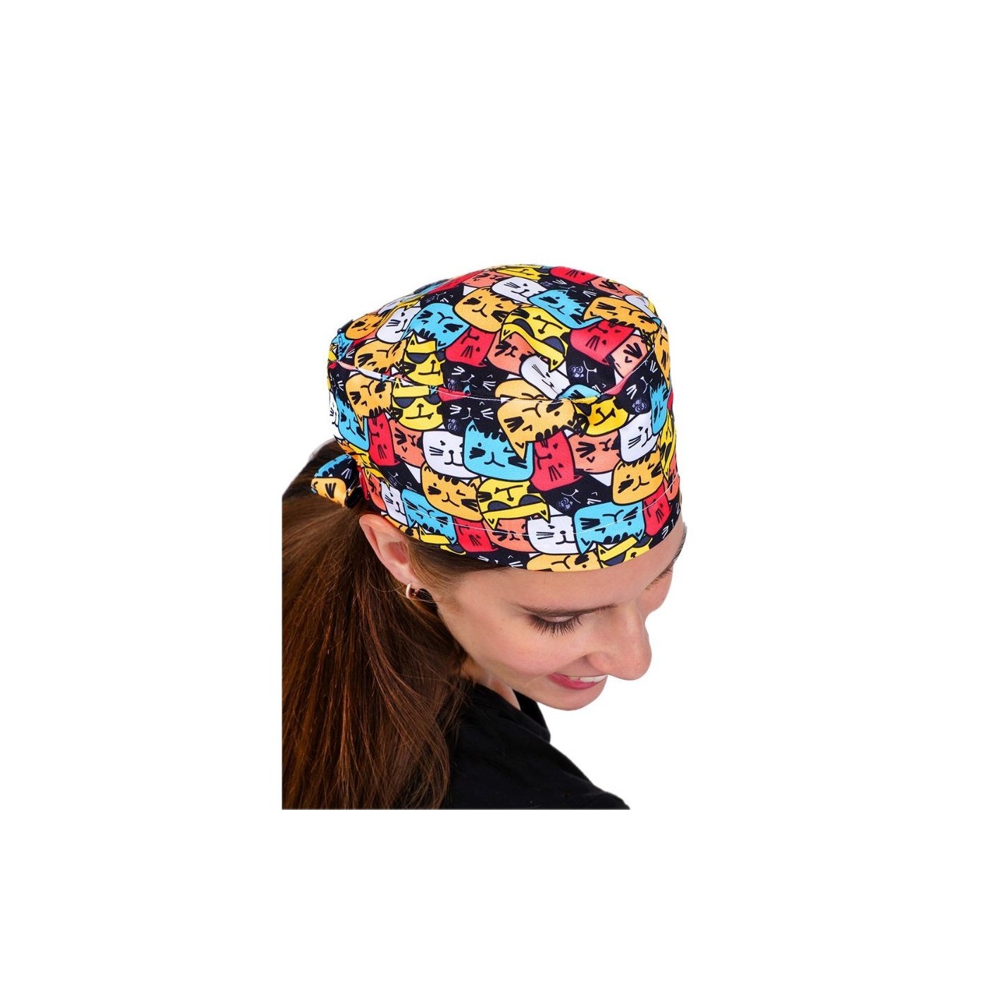 Divertido Gorro unisex con goma y estampado "Caretas" con cintas que se anudan por detrás. Tejido poliéster fino microfibra.