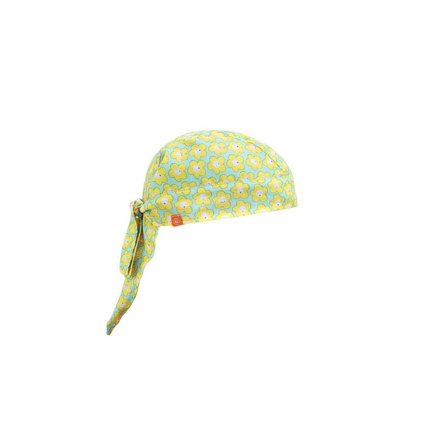 Bandana cocina con estampado de flores, cierre con lazada en la nuca.
