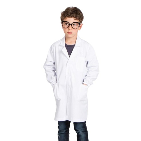 Bata blanca infantil tipo laboratorio. Modelo unisex cerrado mediante botones vistos. Cuenta con cuello de solapa, elástico en los puños, dos bolsillos en laterales y uno en pecho. Confeccionada en SARGA de color blanco. Prenda ideal para colegio, guardería, talleres y actividades extraescolares o familiares.