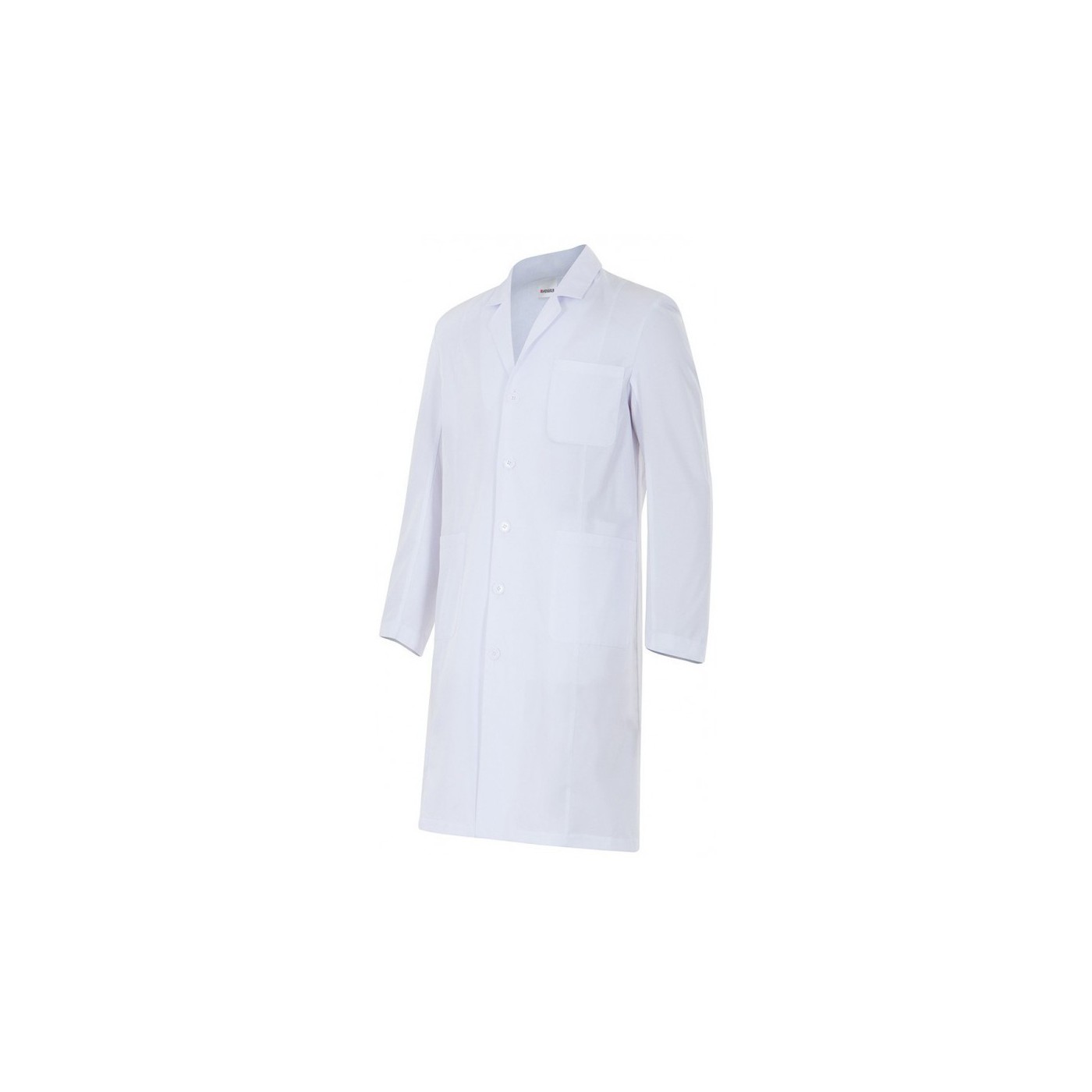 Bata de hombre semientallada con cierre central de botones. Manga tipo sastre, de dos piezas, cuello con solapa y tres bolsillos de parche, dos inferiores y uno en el pecho izquierdo.