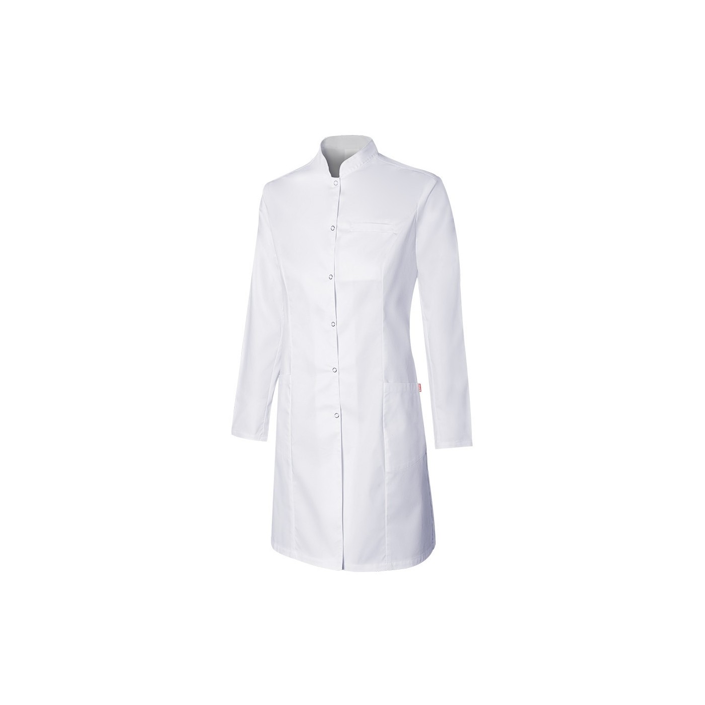 Bata de mujer semientallada con cierre central con botones automáticos. De tejido elástico en composición 62% poliéster, 34% algodón y 4% elastano. Manga tipo sastre, de dos piezas, con tres bolsillos de parche, dos inferiores y uno en el pecho izquierdo.