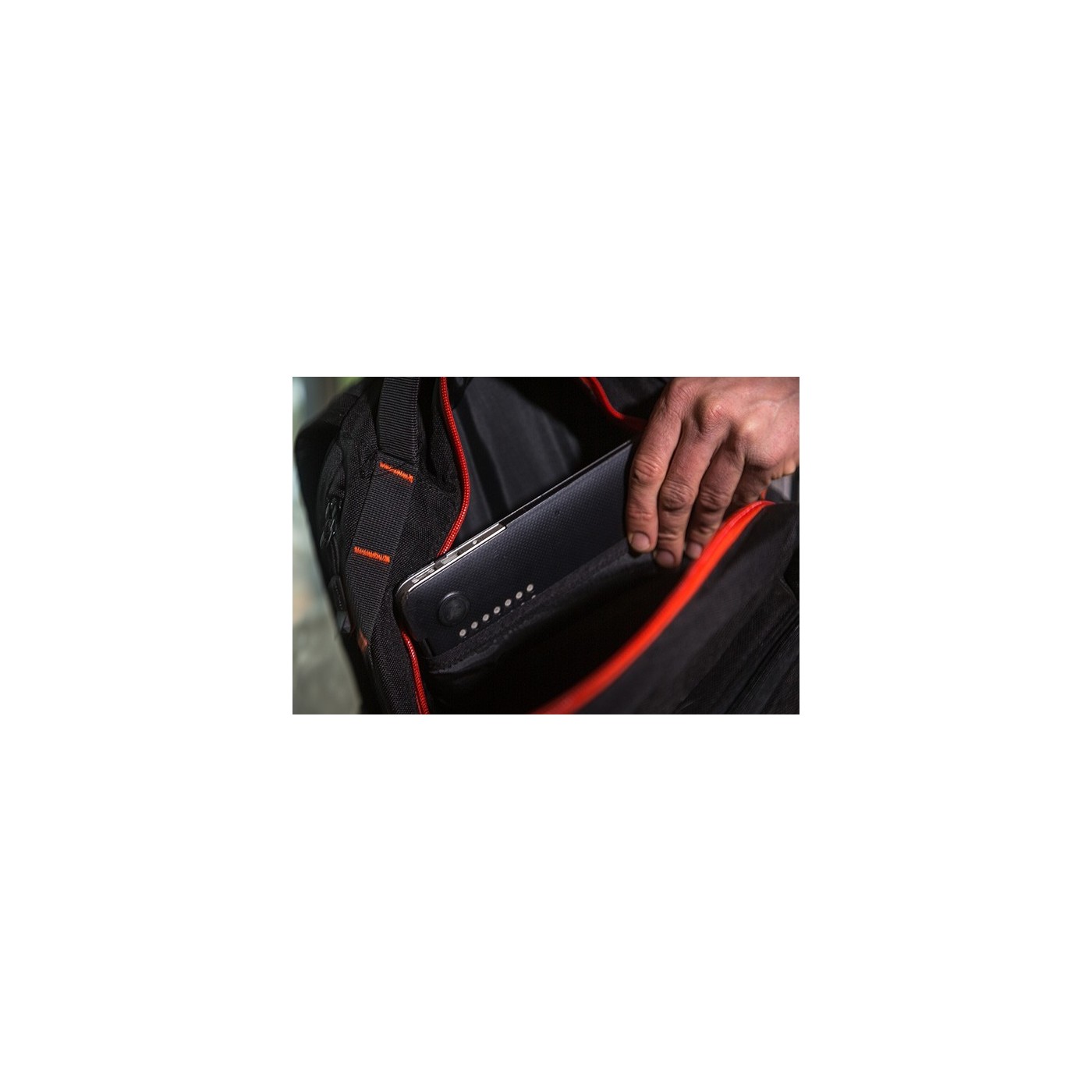 El compartimento principal tiene un bolsillo acolchado para la tableta, un bolsillo interior y otro para bidones