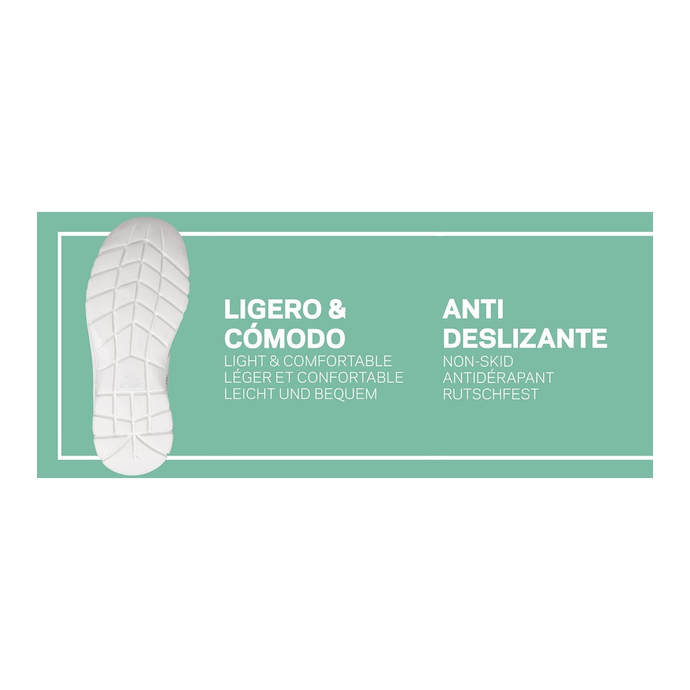 Plantilla acolchada de material textil sobre espuma de poliuretano termoconformado con tratamiento antibacterias y carbón activado. Suela de material compuesto D’LIGHT® antibacteriana, ultra ligera, confortable, flexible y antideslizante, con diseño de pastillas planas, cantos vivos y acanaladuras amplias para facilitar la evacuación de líquidos. Apto para lavado en lavadora hasta 40º.