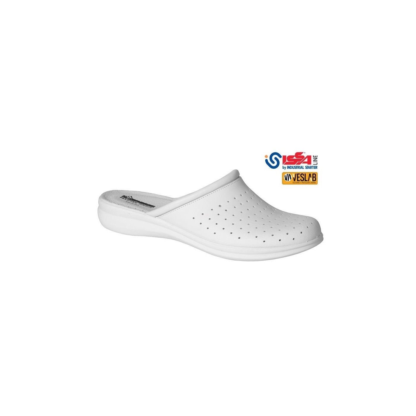 Zueco sanitario con empeine en piel perforada y borde acolchado para obtener la mejor comodidad. Con una plantilla anatómica en piel y suela de poliuretano.