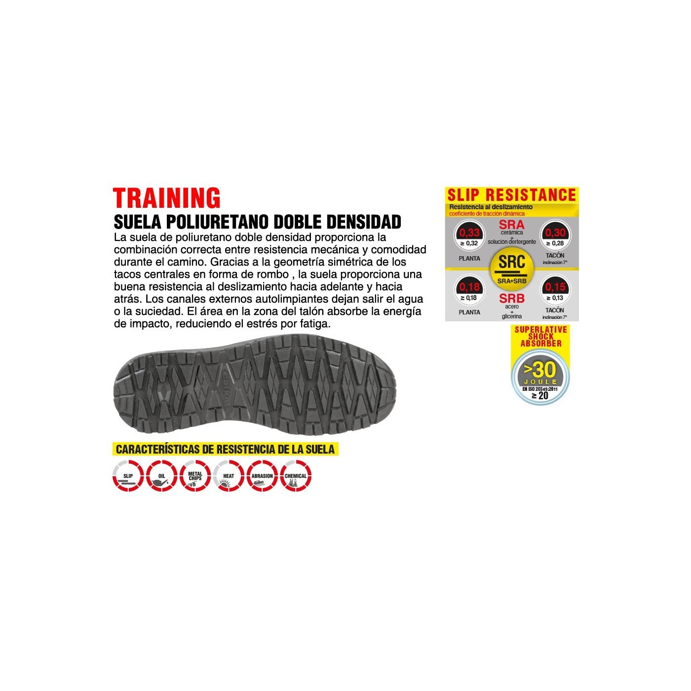 PLANTILLA: EVANIT con especial mezcla de EVA y nitrilo, de gran confort y espesor variable (12mm - 8mm - 3,8mm). Termoformada, anatómica, perforada y forrada con tejido muy transpirable. Antiestática gracias a un tratamiento especial de la superficie y a costuras realizadas con hilos conductores