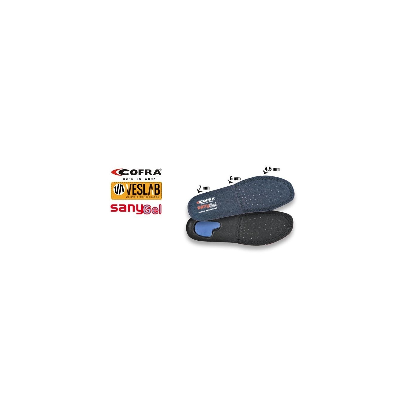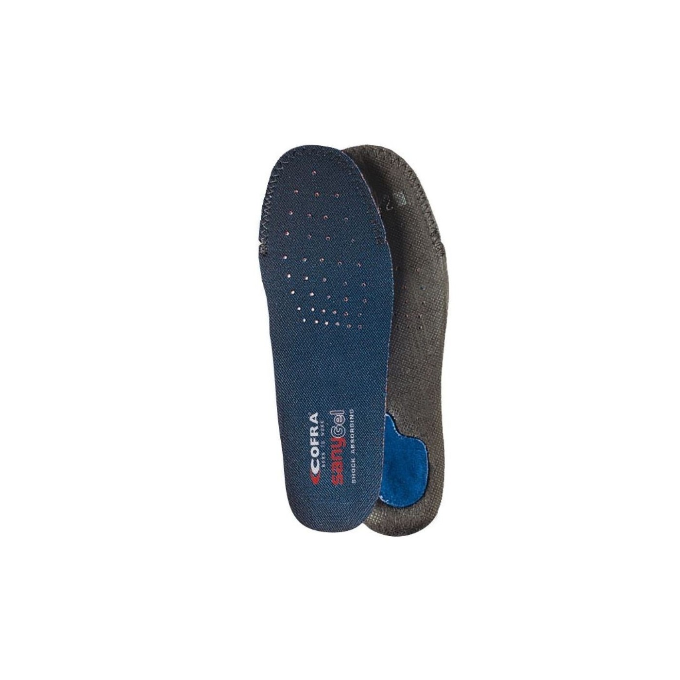 Plantilla Sany-Gel Cofra anatómica, perforada, antiestática gracias a una costura elaborada con hilos conductivos, con gel debajo del talón; su forro en contacto con la piel absorbe el sudor de toda la planta y favorece la transpirabilidad