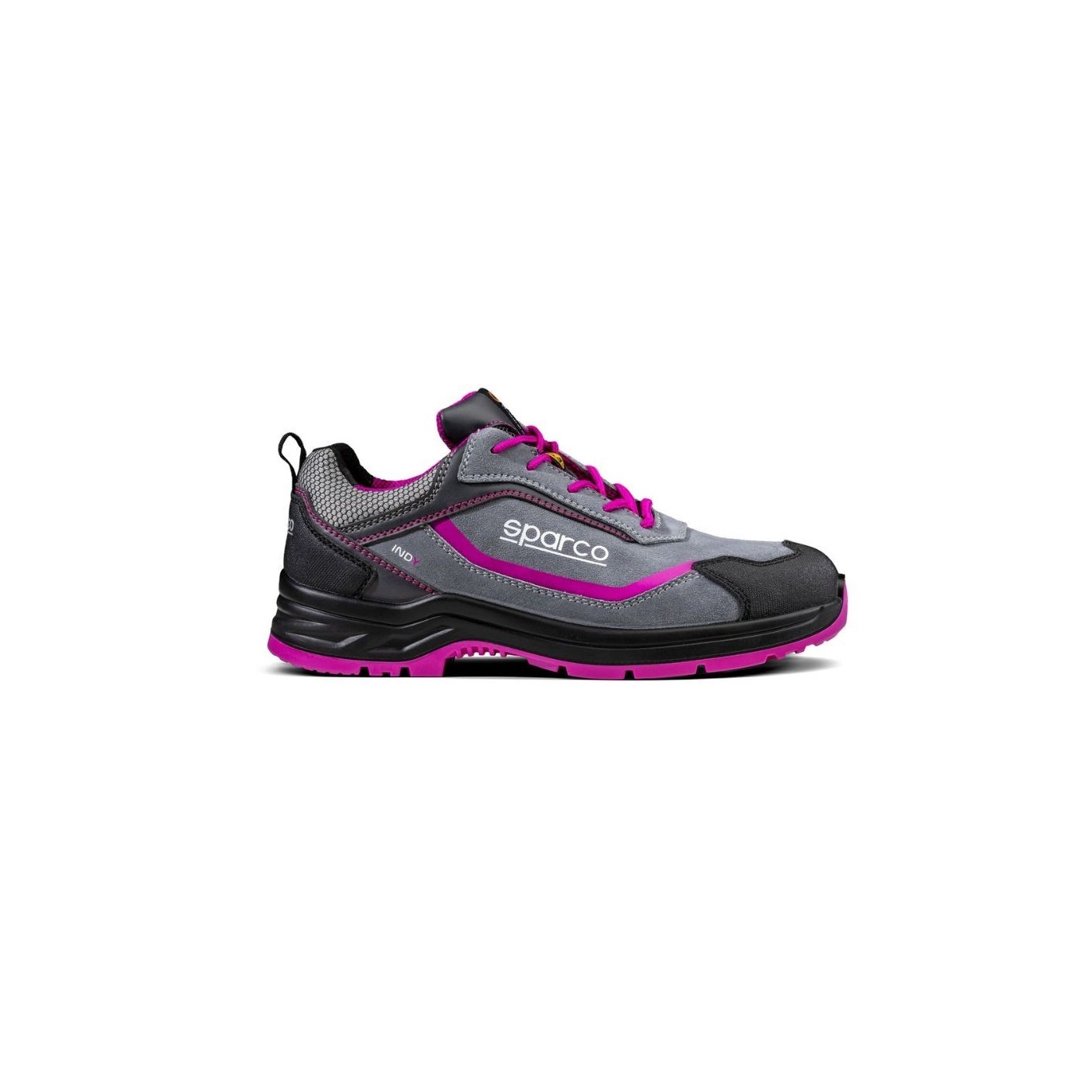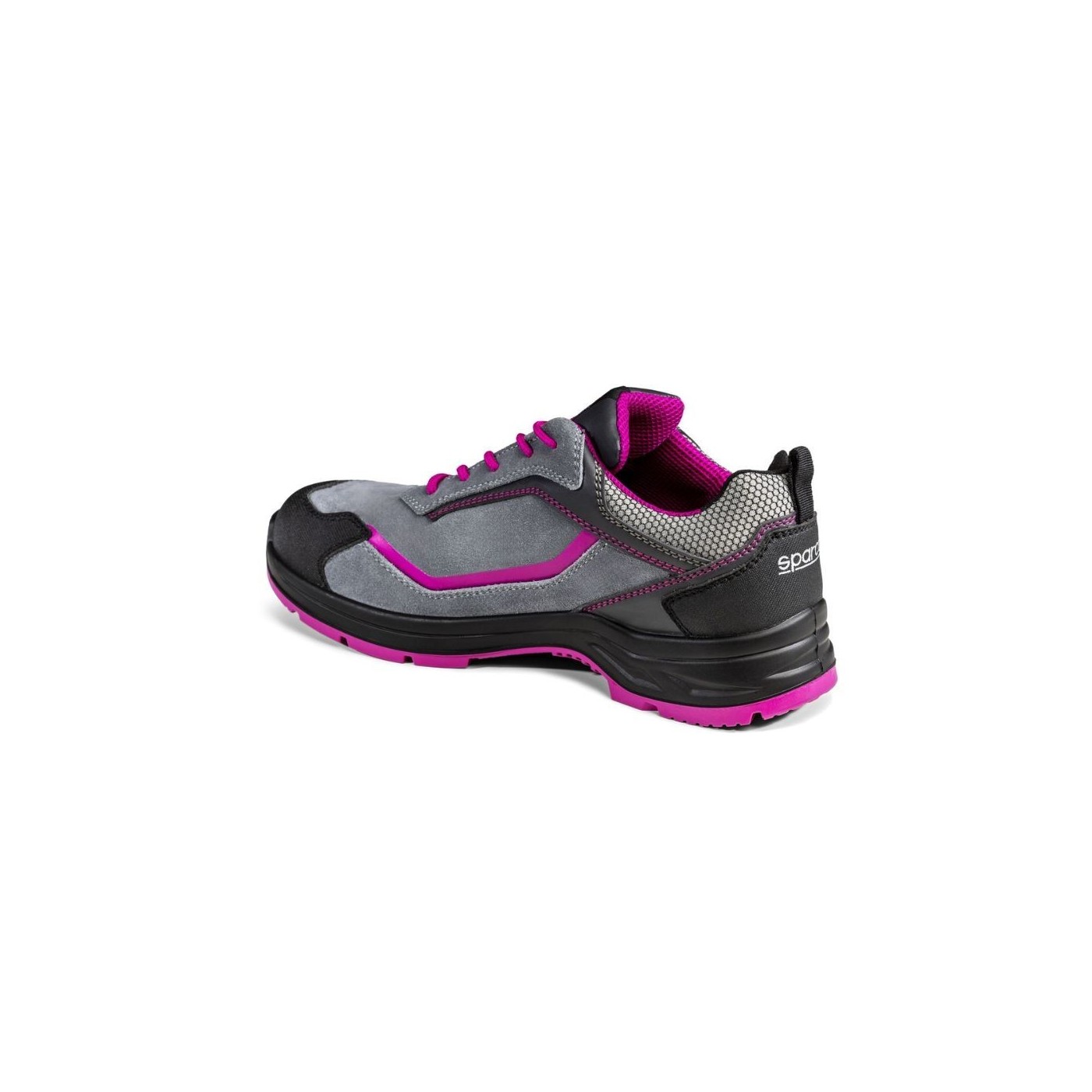 Zapatillas de seguridad para mujer DANICA Sparco Teamwork, fabricadas en piel velour hidro repelente con puntera de fibra de vidrio resistente a 200J, plantilla anti perforación ultraligera y suela PU bi-densidad con diseño Ladder Grip para trabajos en escalera.