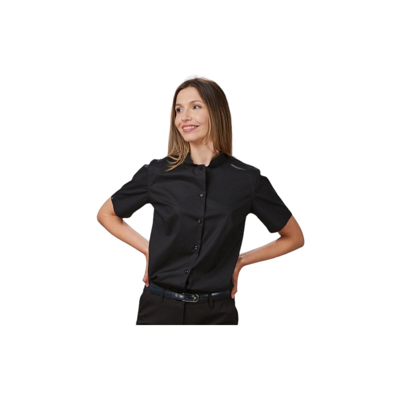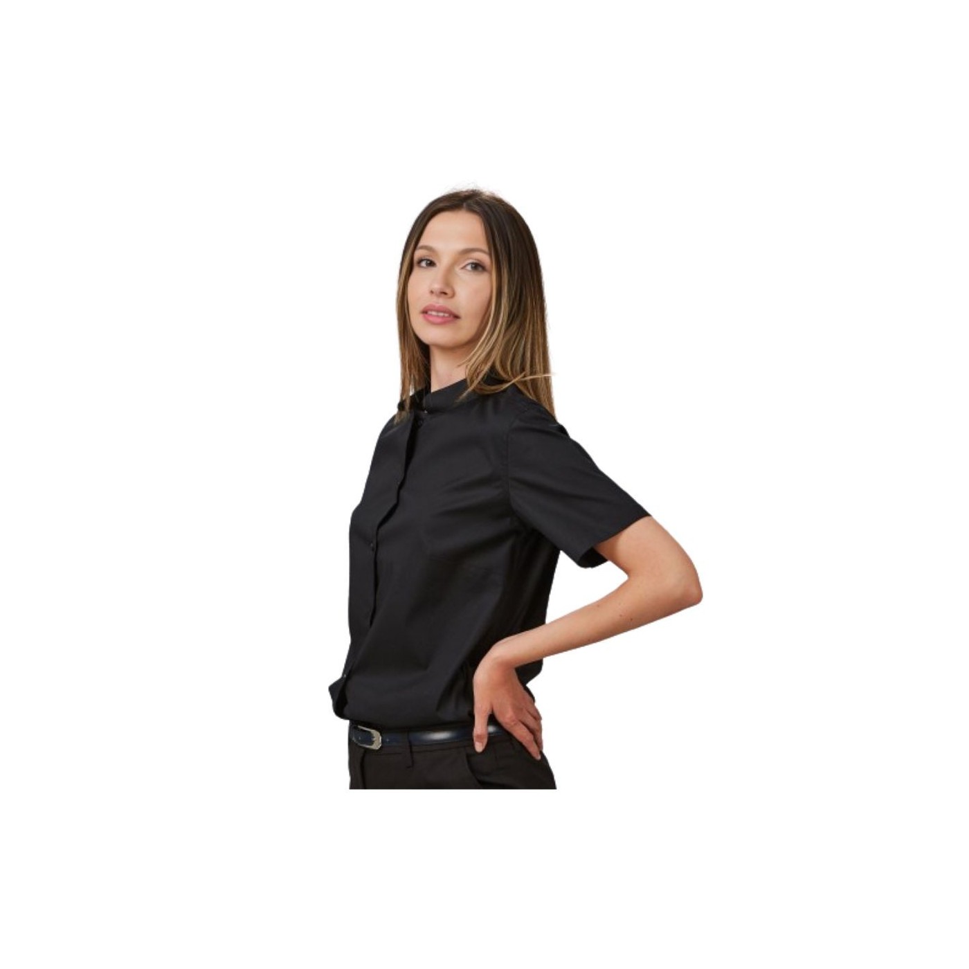CAMISA MUJER M/C C/MAO "RED LINE" de Gary's: Elegante y cómoda, con cuello mao y manga corta. Disponible en blanco y negro, con pinzas que realzan la silueta. Ideal para hostelería y negocios, garantizando estilo y durabilidad.