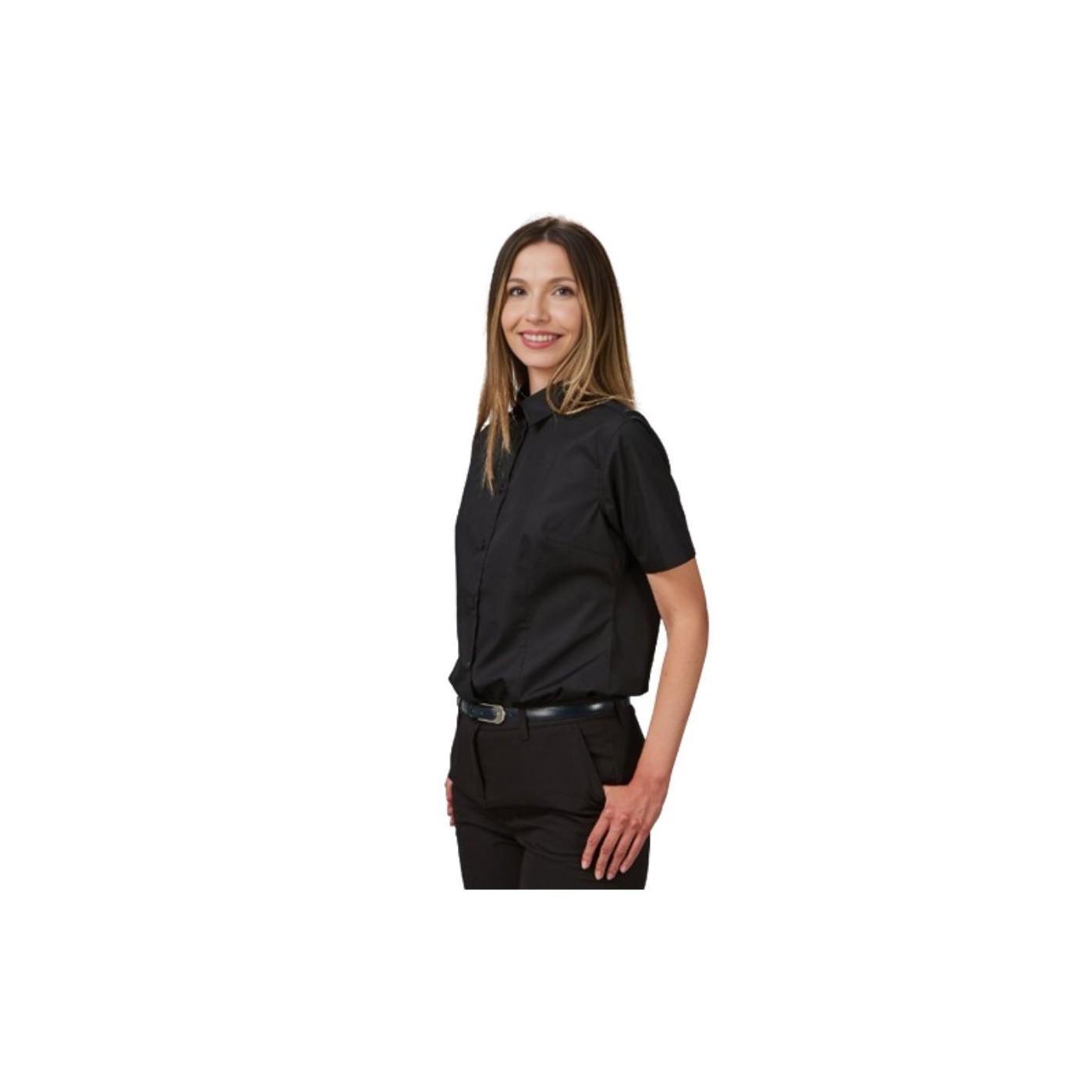 CAMISA MUJER M/C POP. "RED LINE" de Gary's: Elegante y versátil con manga corta y diseño contemporáneo en blanco o negro. Ajuste perfecto con pinzas en pecho y espalda que realzan la figura femenina. Ideal para hostelería, oficinas y comercios, garantizando estilo y comodidad duradera.