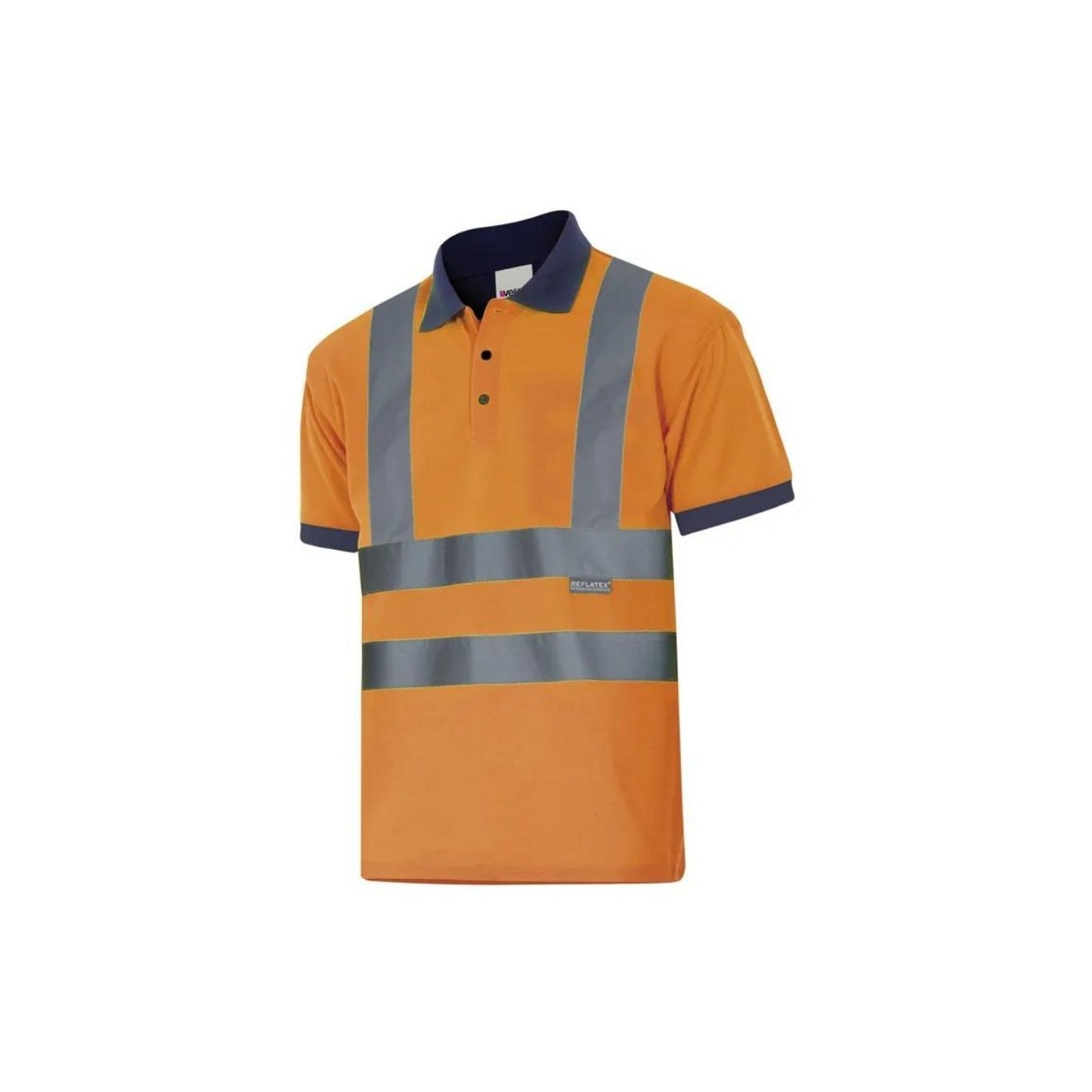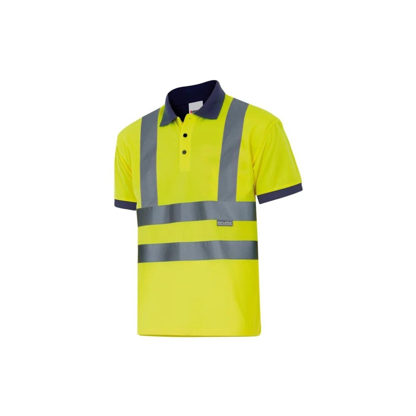 Polo bicolor de alta visibilidad de manga corta realizado en tejido transpirable. Cintas reflectantes en el torso y hombros, cuello de canalé en color contraste con abertura central con botones.