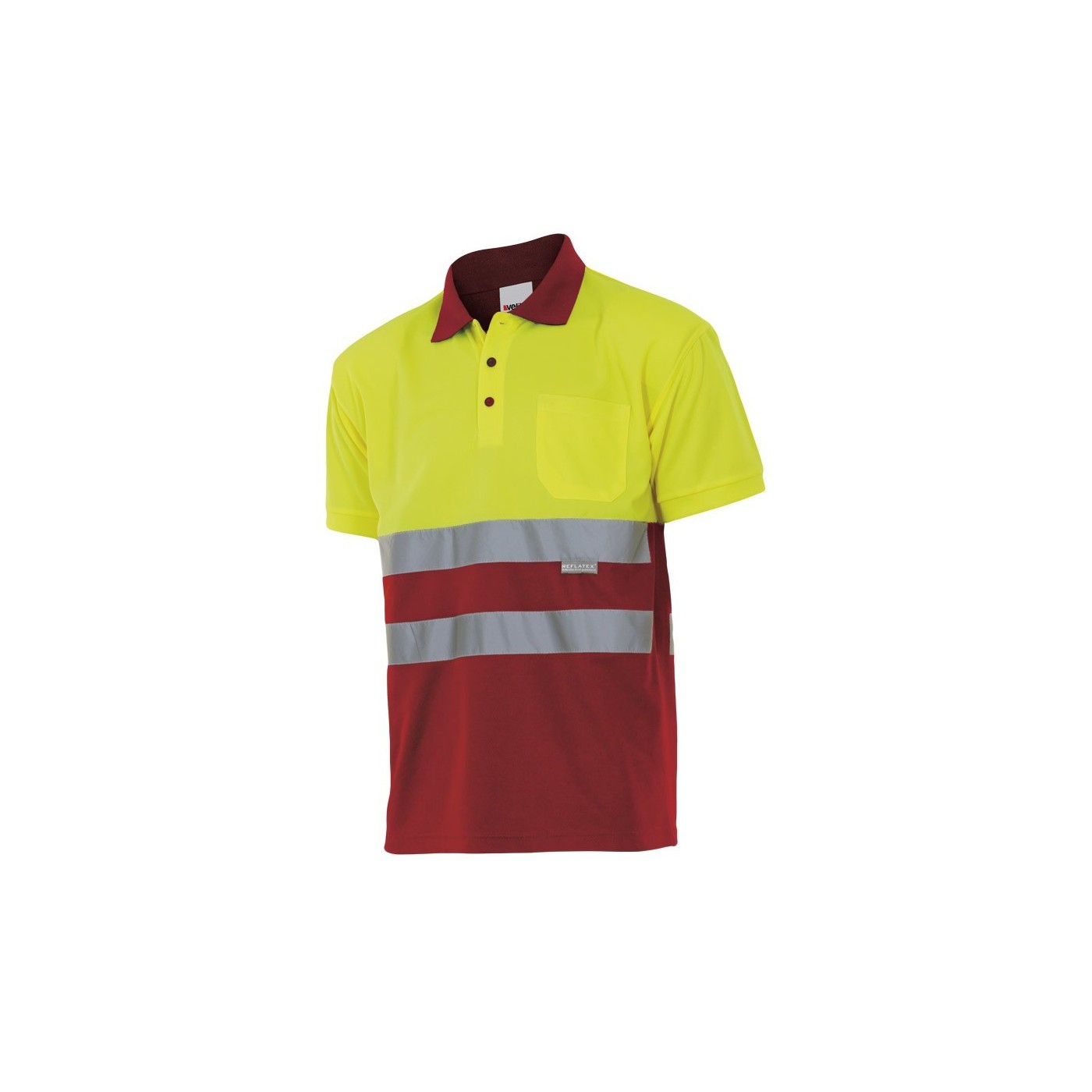 Polo bicolor de alta visibilidad de manga corta realizado en tejido transpirable. Cintas reflectantes en el torso, cuello de canalé en color contraste con abertura central con botones y un bolsillo en el pecho.