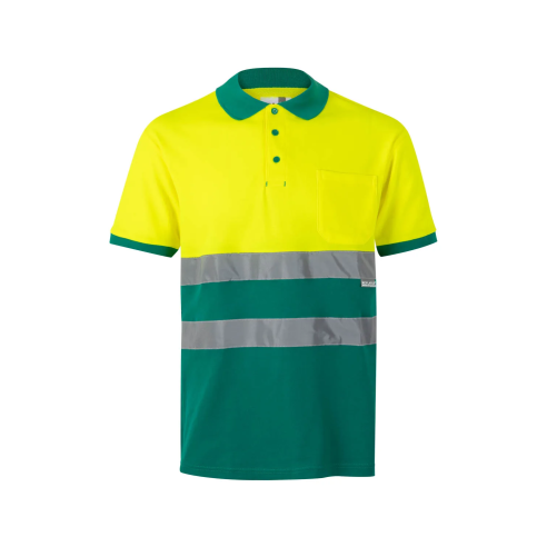Polo de algodón bicolor de alta visibilidad en manga corta. Muy recomendable para evitar los golpes de calor debido a que es mucho más transpirable que los habituales de poliéster en esta línea.