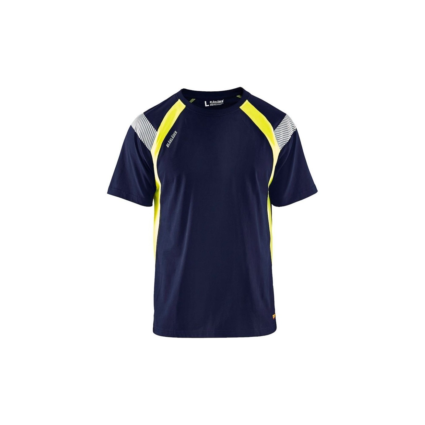 Camiseta de alta visibilidad Blaklader con diseño en 100% algodón para comodidad en áreas oscuras. Paneles de poliéster fluorescente garantizan una mayor visibilidad. Cuenta con cinta reflectante en los hombros y cuello redondo para ajuste normal. Certificación de alta visibilidad no aplicable.