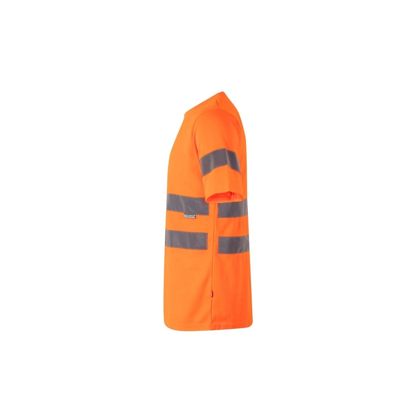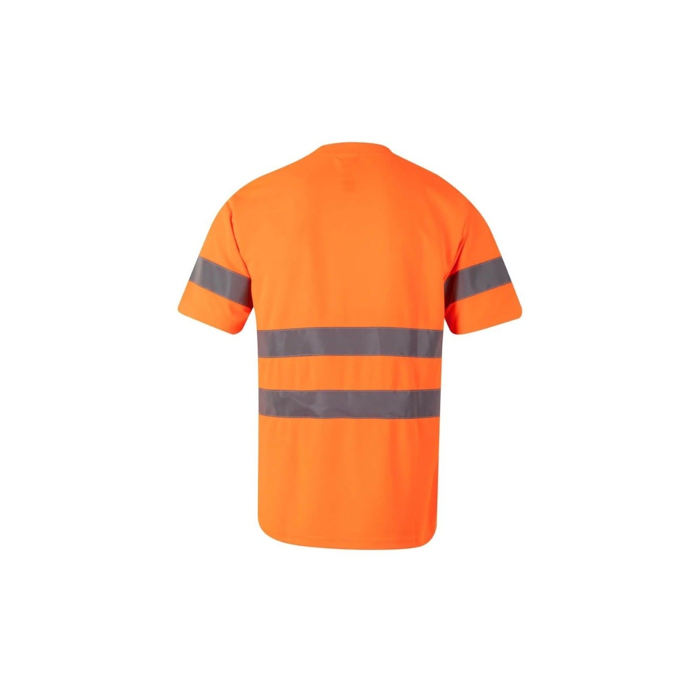 Camiseta Técnica de Alta Visibilidad Velilla con cuello redondo de canalé para comodidad, cintas reflectantes en torso y mangas para visibilidad, y cinta de tejido base que cubre la costura del cuello para suavidad.