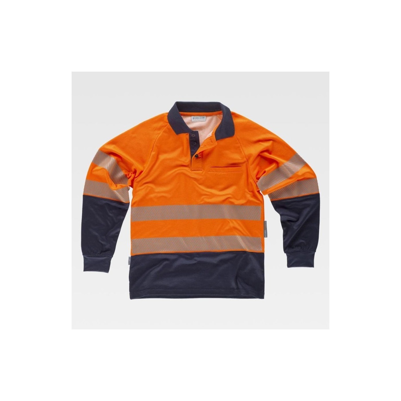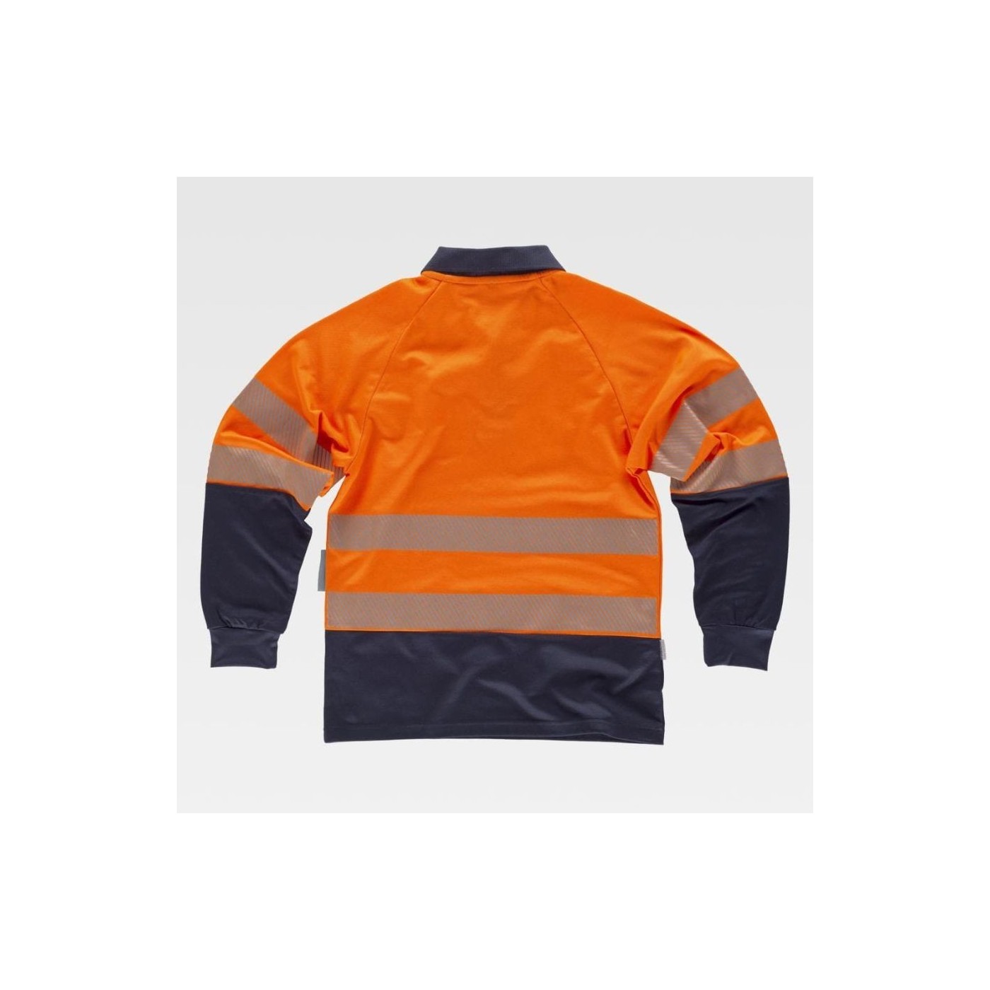 Polo de alta visibilidad bicolor en manga larga de tejido micropiqué de poliéster, con alta visibilidad y detalles reflectantes. Cuenta con rejilla en las axilas para mejor transpiración, cuello clásico con tapeta de tres botones y bolsillo de pecho. Ideal para entornos laborales que requieren seguridad y comodidad.