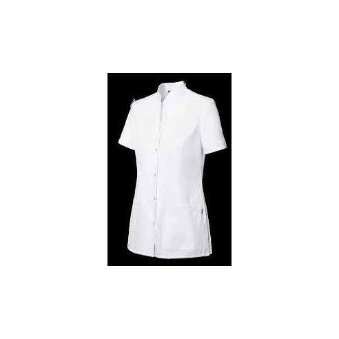 Chaqueta entallada de manga corta con cuello tipo chimenea. Cierre central con cremallera y dos boldillos en la parte inferior.