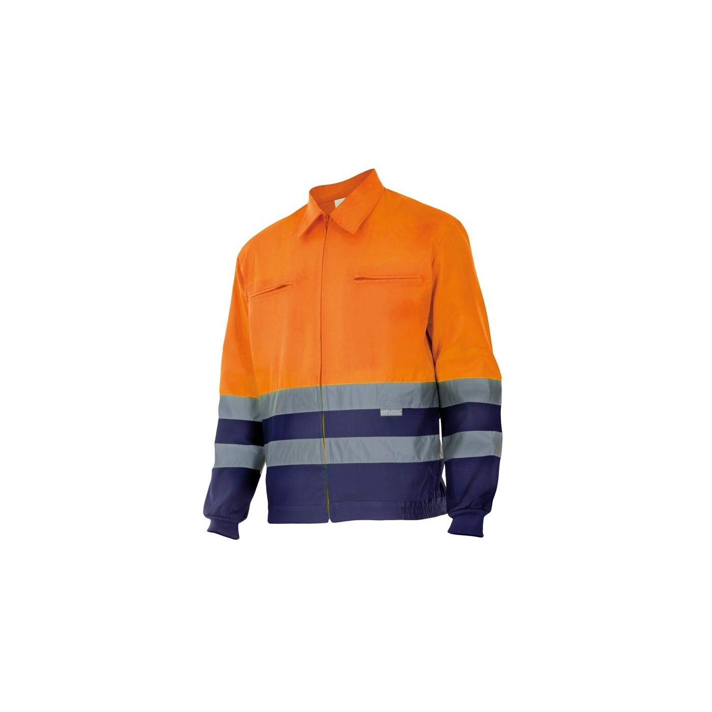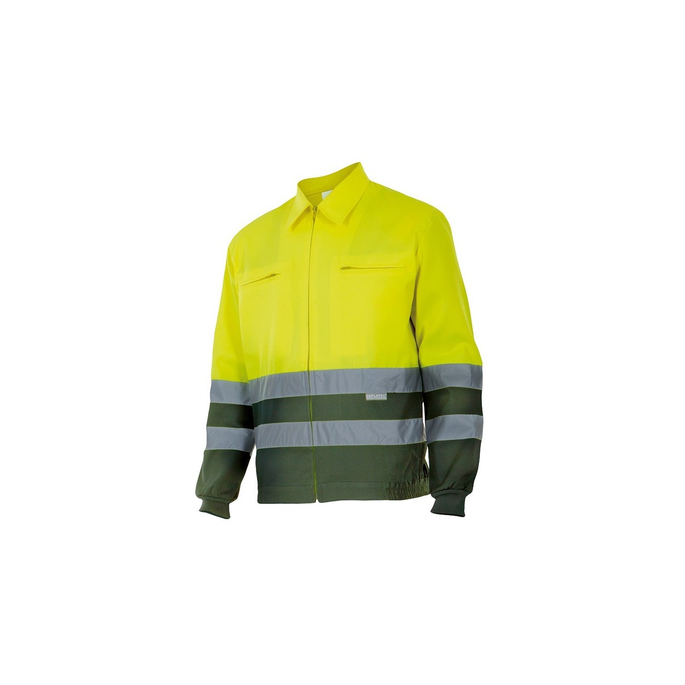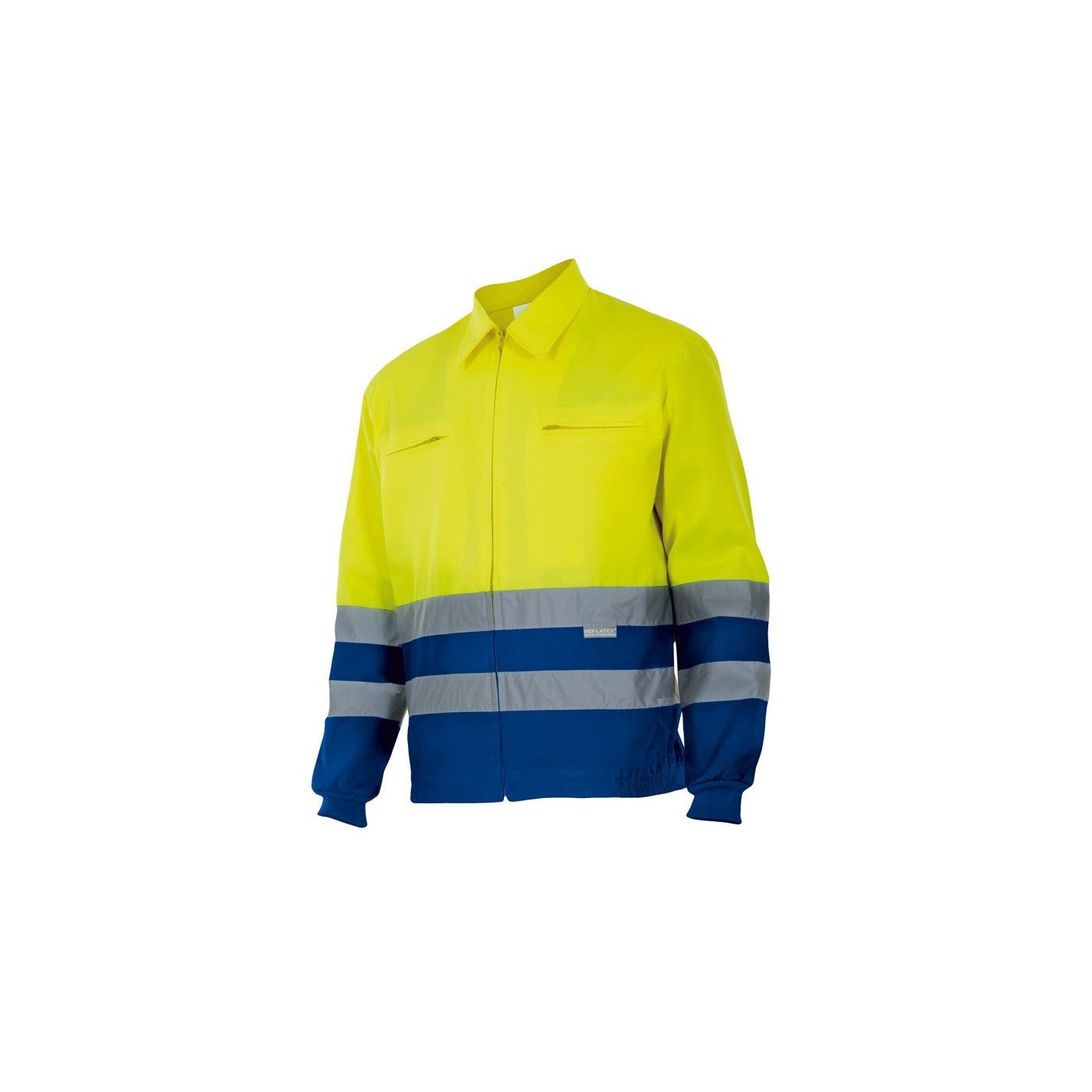 Cazadora bicolor de alta visibilidad con cintas reflectantes en torso y mangas. Cremallera central, puños de canalé y dos bolsillos en el pecho con cremallera.