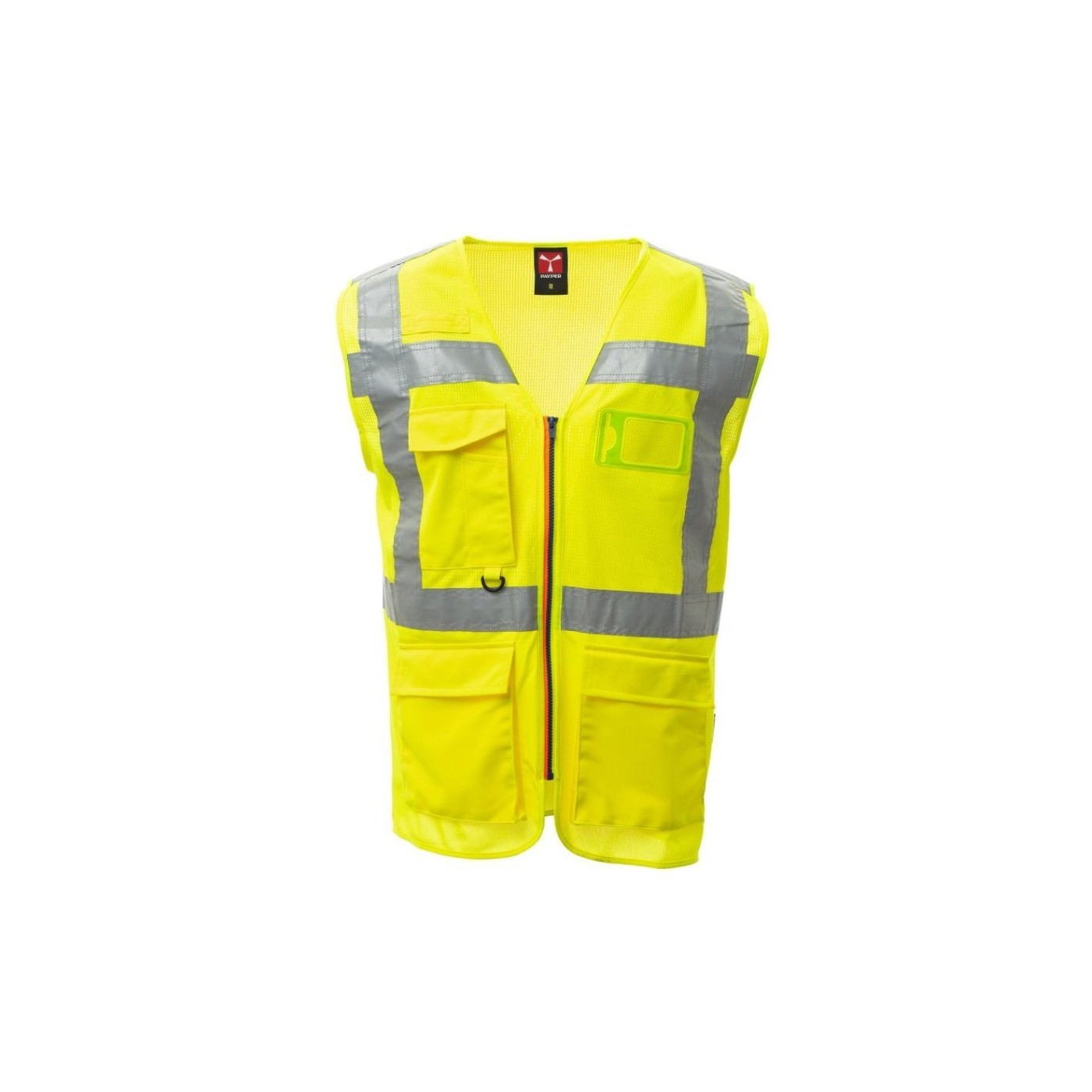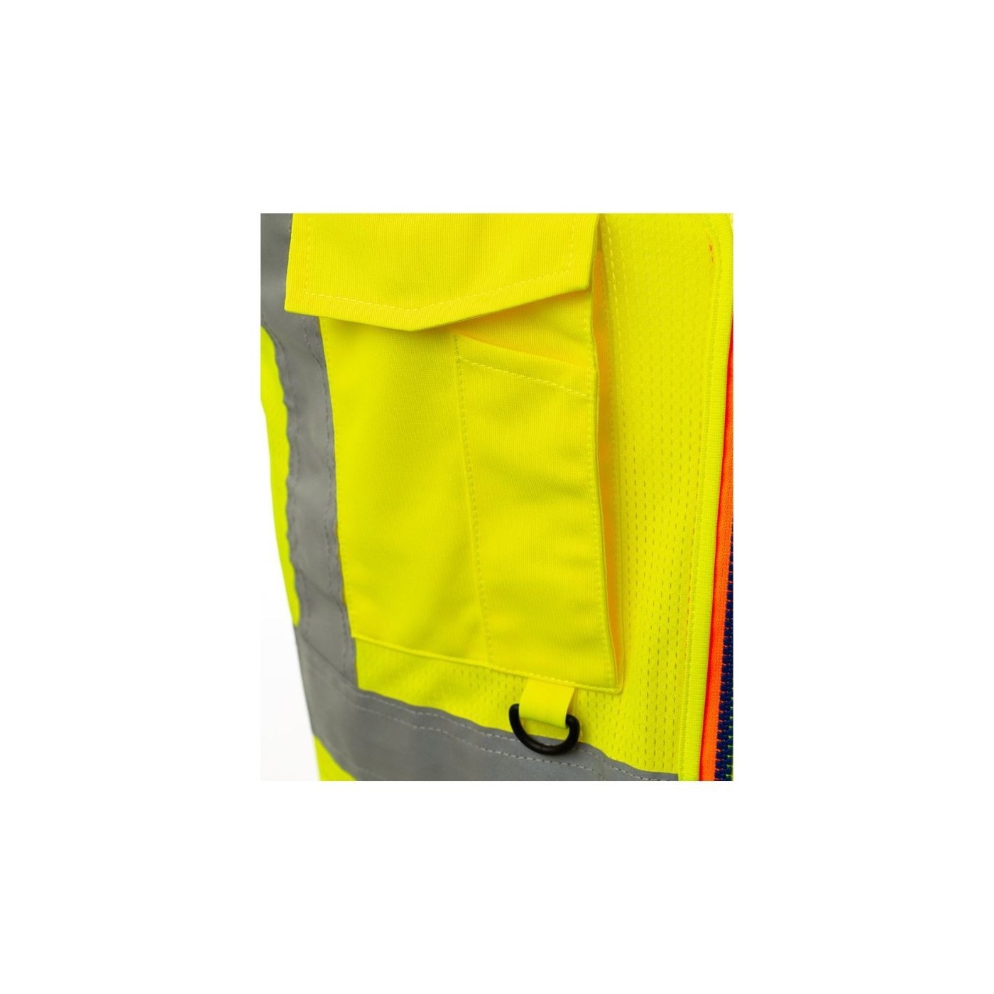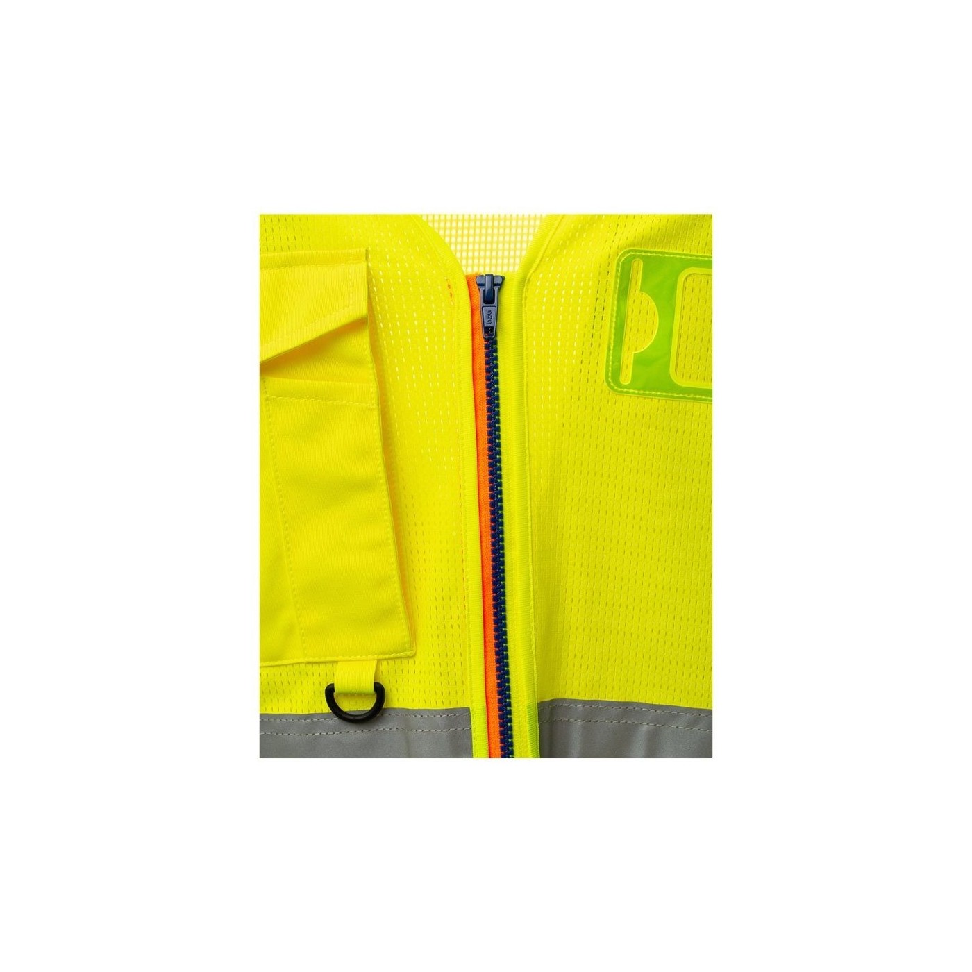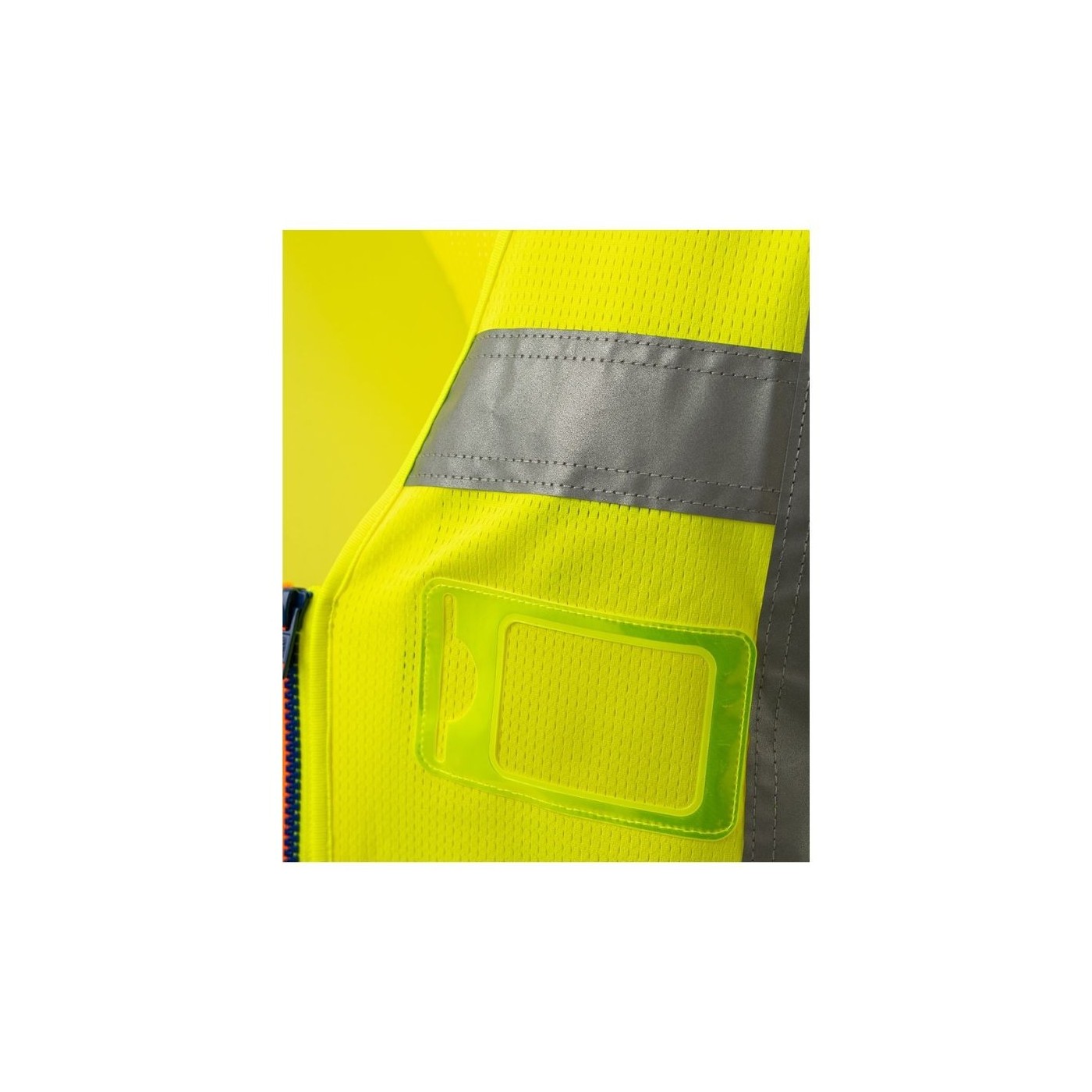 Chaleco de alta visibilidad confeccionado en malla transpirable en la parte superior y en tejido Dry-Tech en la parte inferior, con bandas retrorreflectantes horizontales en hombros, pecho y cintura y dos bandas retrorreflectantes verticales. Cierre con cremallera SBS, con cinta bicolor. Soporte fijo para tarjeta de identificación a la altura del pecho izquierdo con la prenda puesta. Trabilla multifunción, un bolsillo para bolígrafos cerrado con velcro y anilla en el pecho derecho con la prenda puesta. Dos bolsillos exteriores con fuelle cerrados con velcro en la parte superior y apertura lateral.