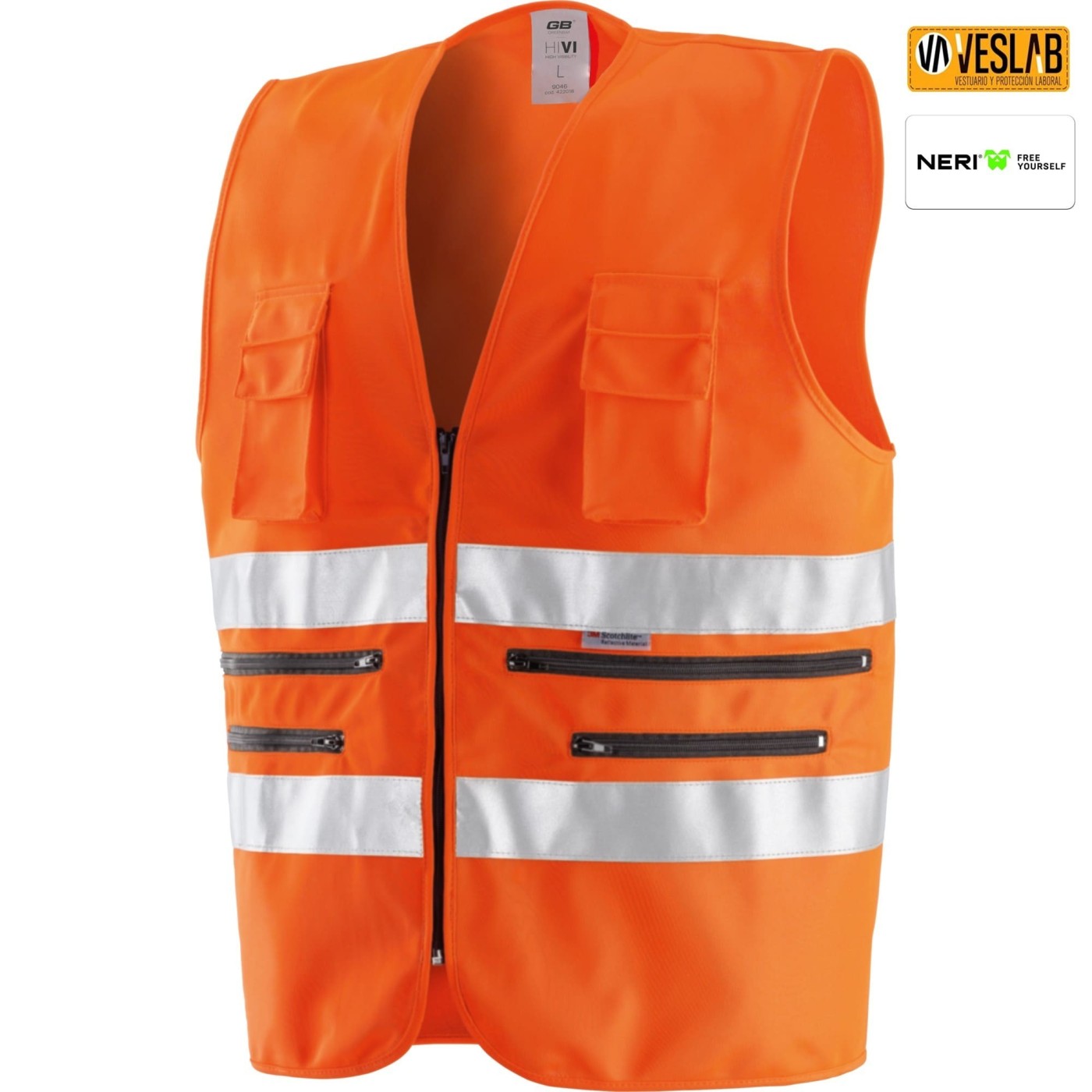 El chaleco de alta visibilidad 422018 - 9046 de Neri es ideal para garantizar la seguridad en entornos laborales. Está fabricado con poliéster y cuenta con cierre de cremallera, 4 bolsillos exteriores con cremallera, 2 bolsillos en el pecho con solapa y velcro, y 2 bandas retrorreflectantes horizontales.