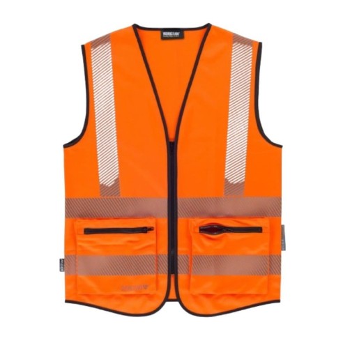 Chaleco de alta visibilidad con cintas reflectantes segmentadas, cremallera frontal y bolsillos laterales con fuelle. Ligero, seguro y práctico.