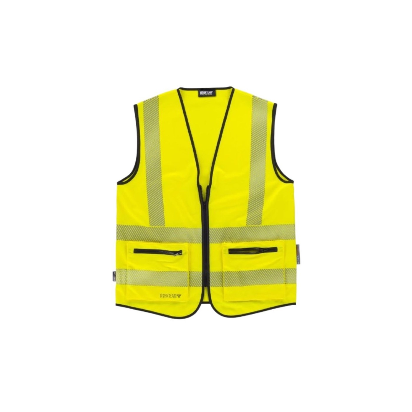 Chaleco de alta visibilidad con cintas reflectantes segmentadas, cremallera frontal y bolsillos laterales con fuelle. Ligero, seguro y práctico.