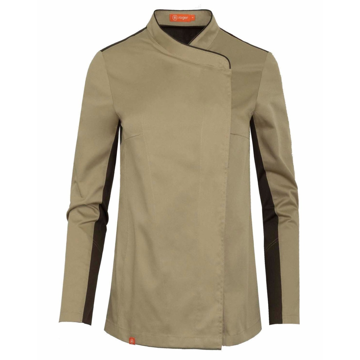 Chaqueta de cocina entallada para mujer de composición y tallaje muy cómoda, femenina y favorecedora. Botonadura oculta cruzada y elegante cuello mao. Elaborada con tejido COOLMAX en la espalda que mejora la transpirabilidad y elasticidad del movimiento. Pequeño bolsillo en la manga izquierda.