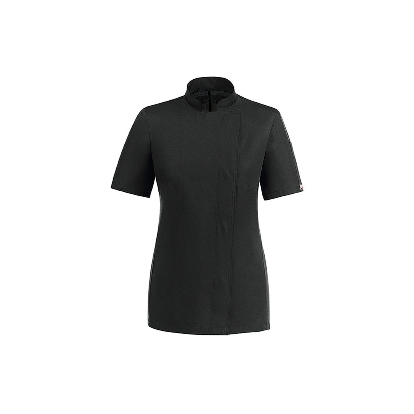Chaqueta de cocinera EGOCHEF modelo 1009001E EASY GIRL en color blanco y negro, diseñada para mujeres con sistema Air Plus en la espalda para transpiración. Fabricada en 100% microfibra, 130 grs, es impermeable y no requiere plancha. Incluye manga corta, cuello mao, y corchetes ocultos.