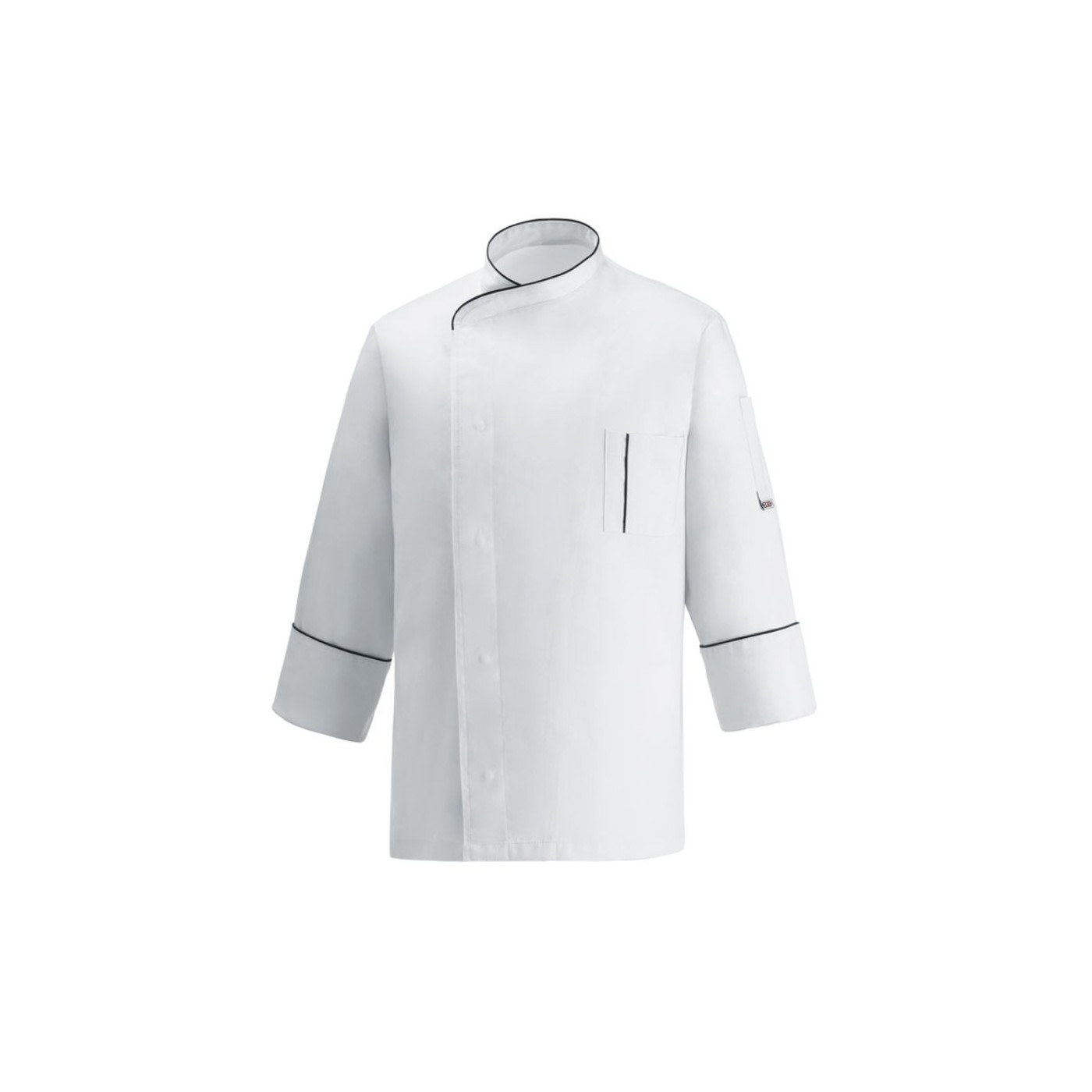 Color blanco. Ribete negro en cuello, puños y bolsillo.