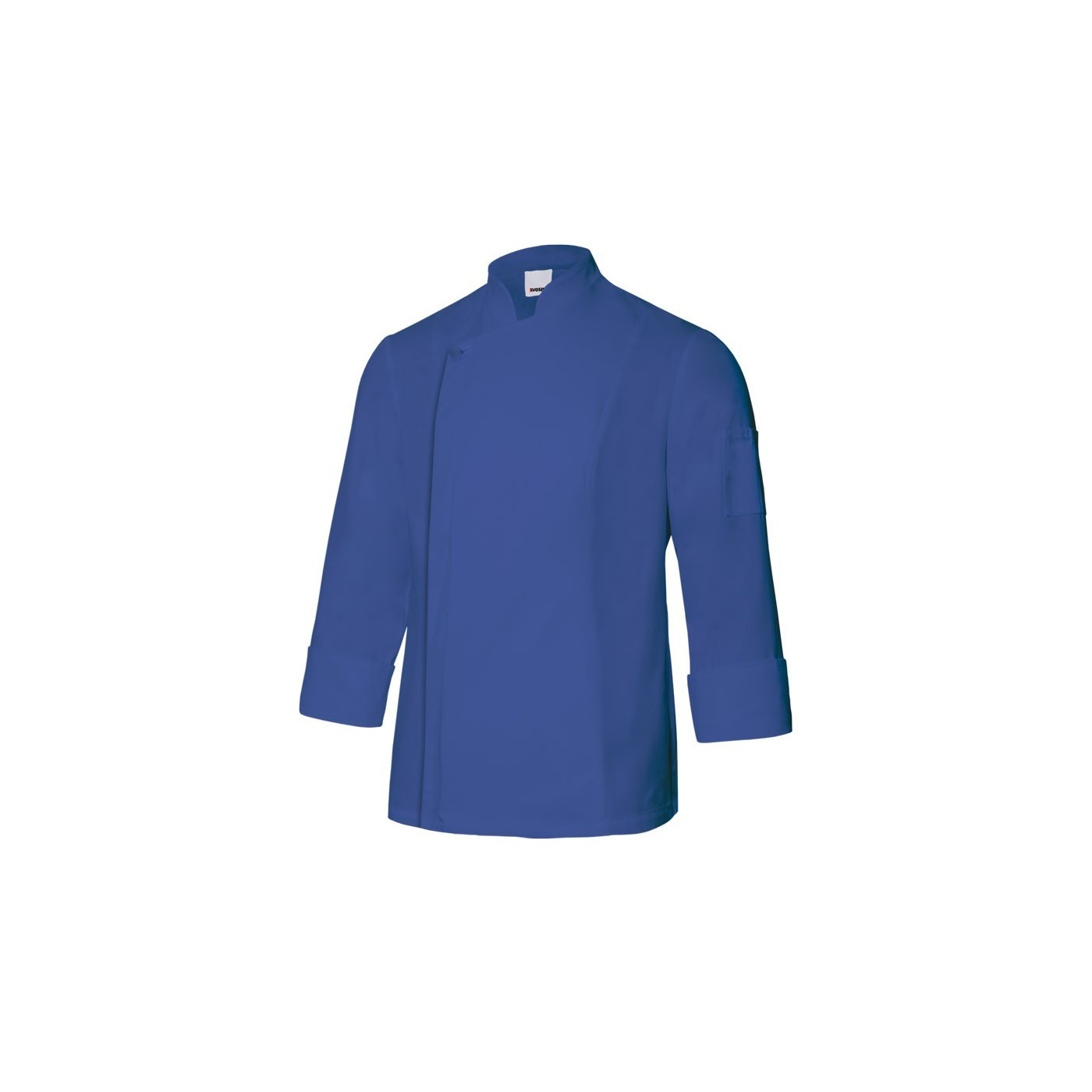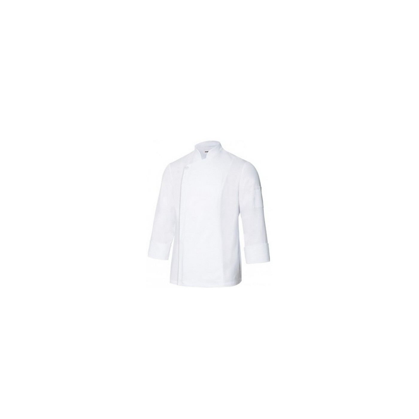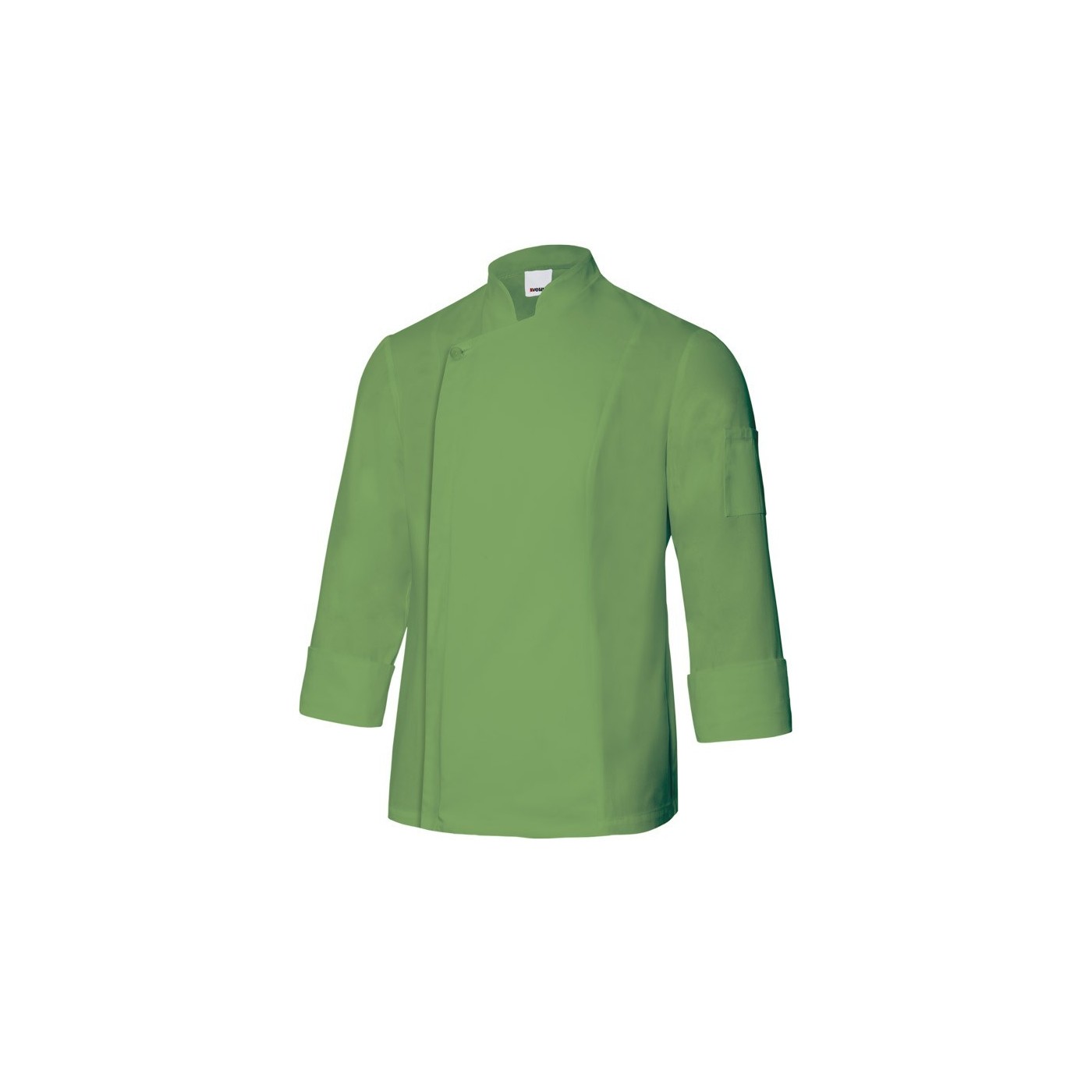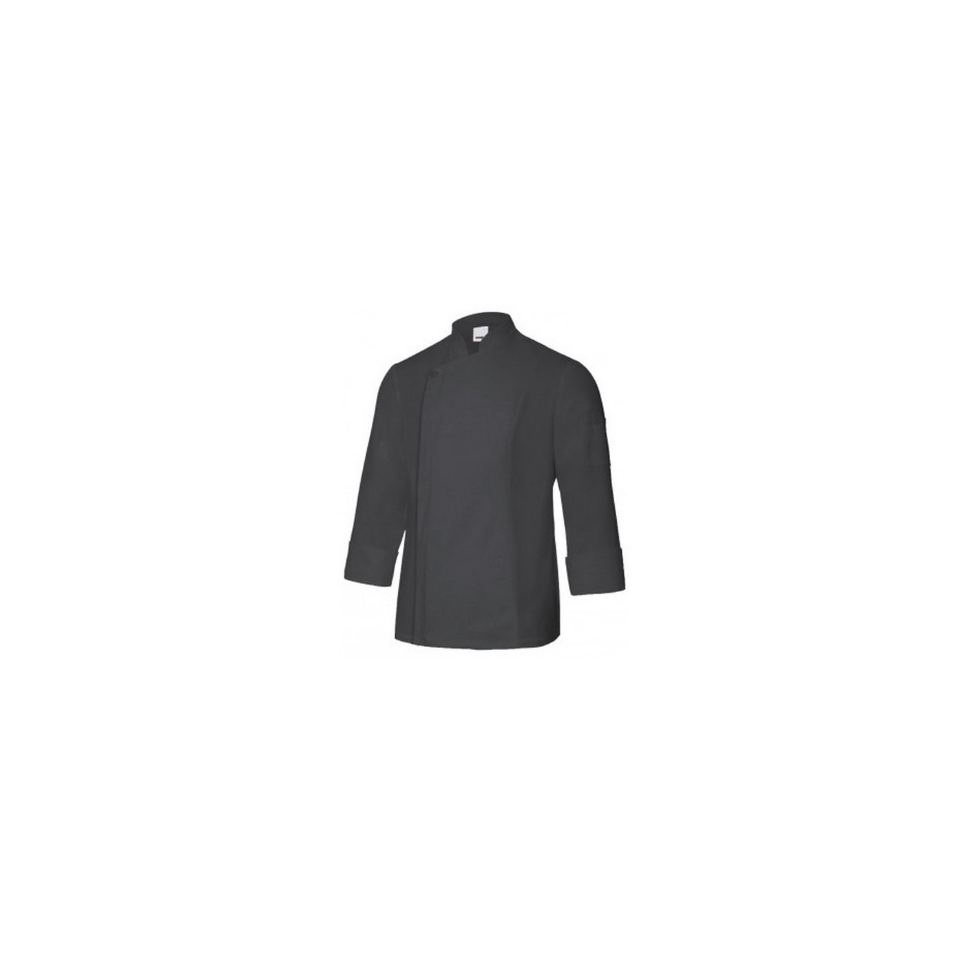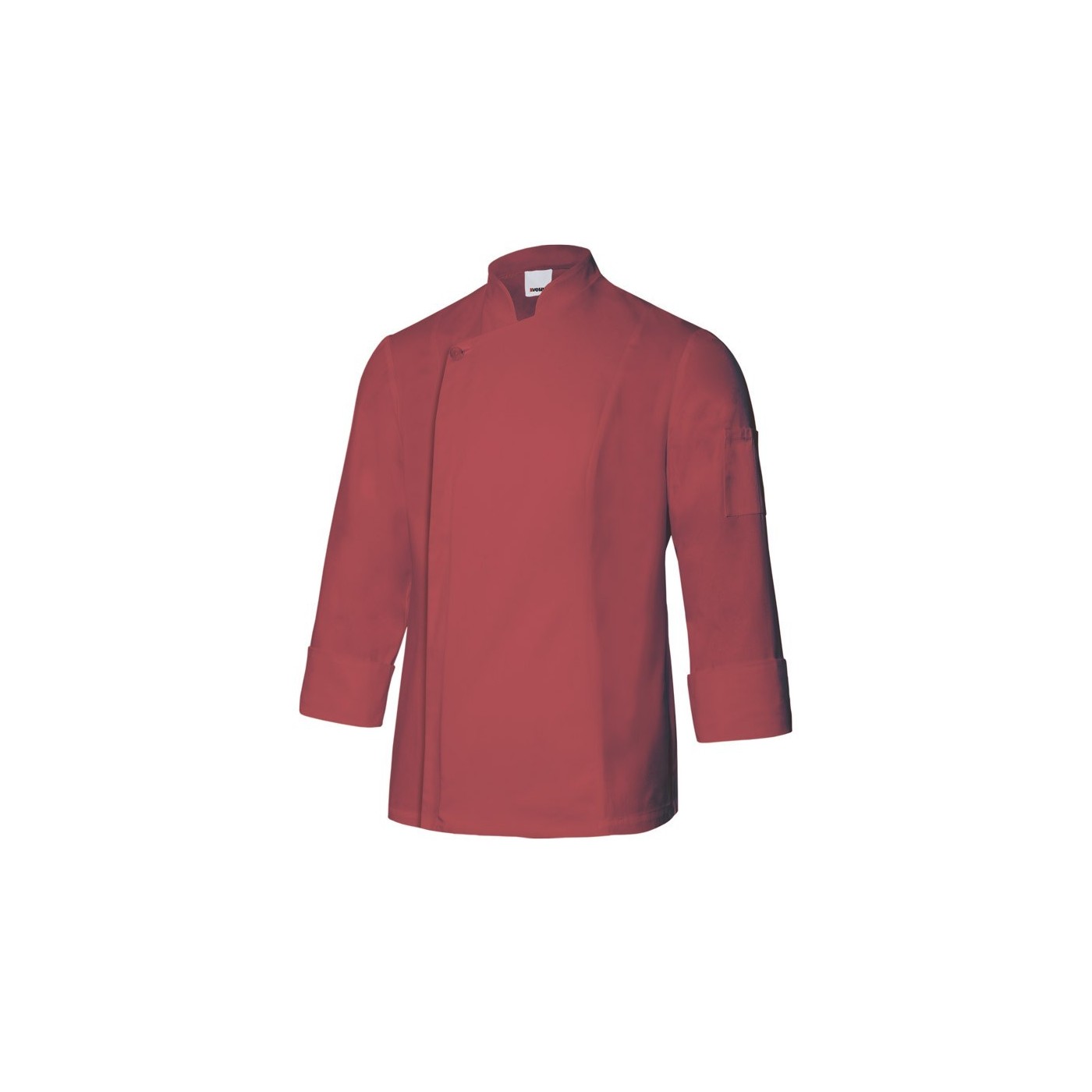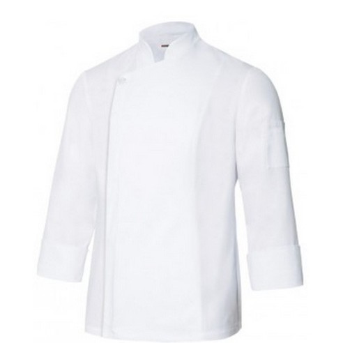 Chaqueta de cocinero con cuello mao, cierre asimétrico con cremallera oculta y un botón en el cuello, abertura lateral en los puños y bolsillo en la manga.