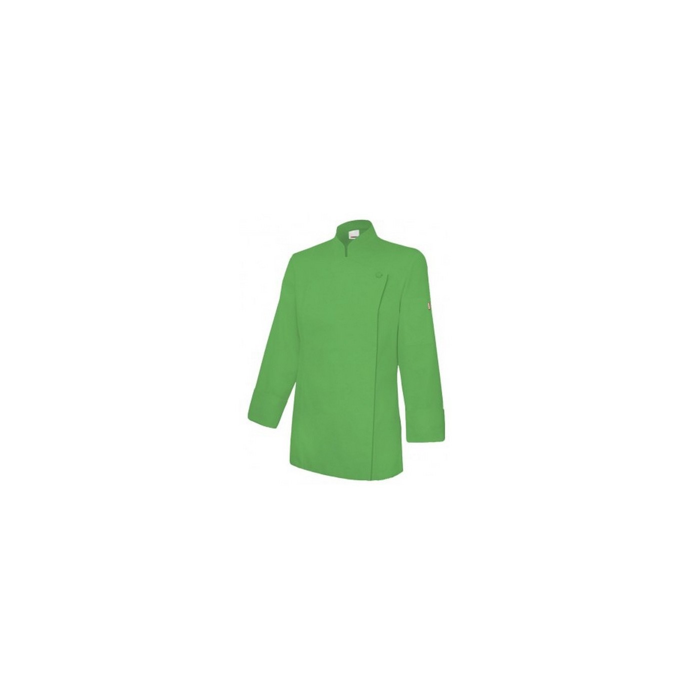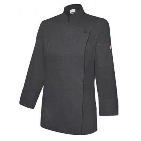 Chaqueta de cocinera con cuello mao, cierre asimétrico con cremallera oculta y un botón en el cuello, abertura lateral en los puños y bolsillo en la manga.