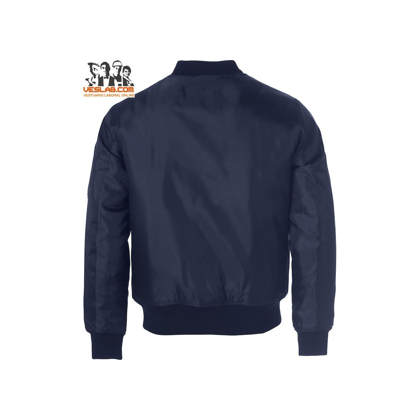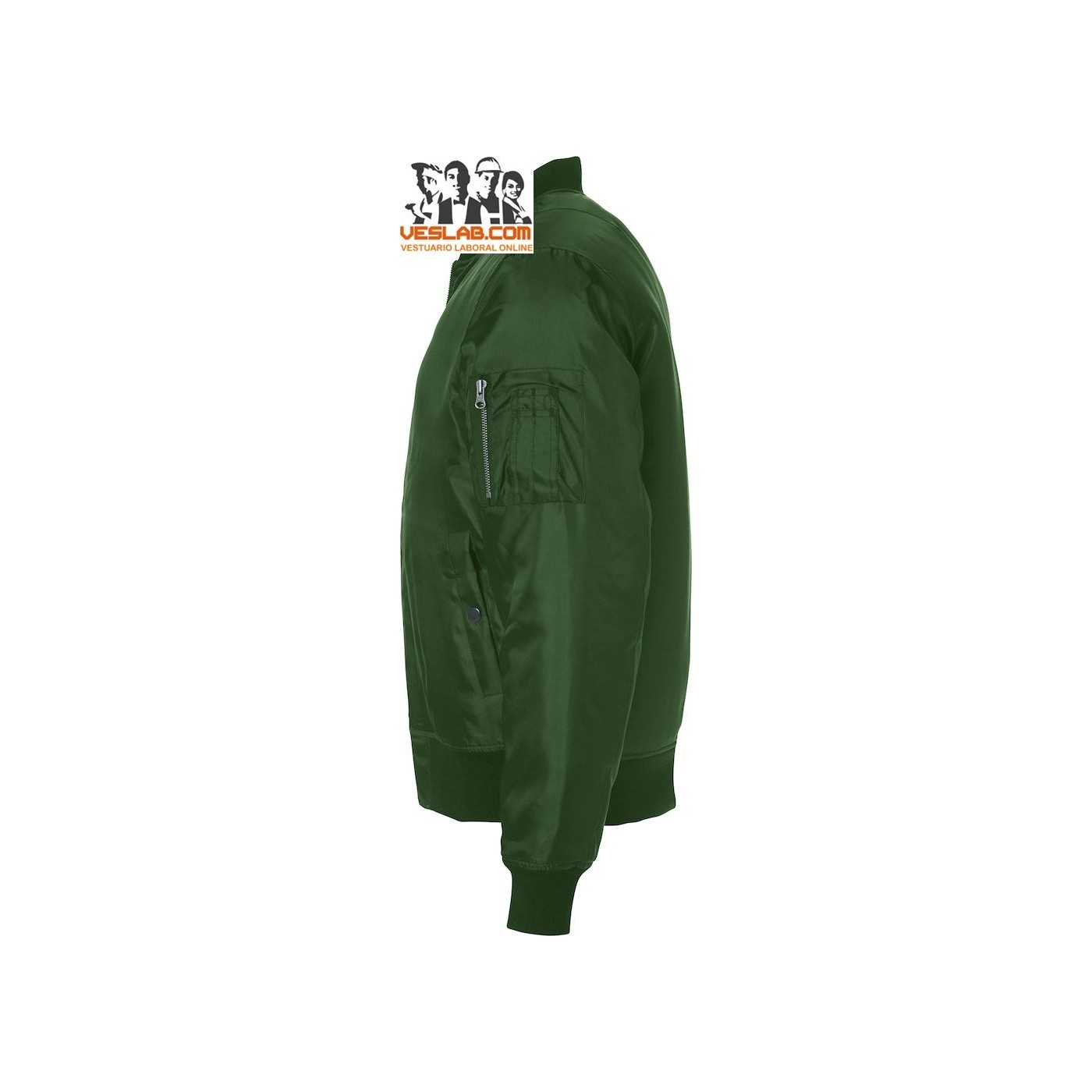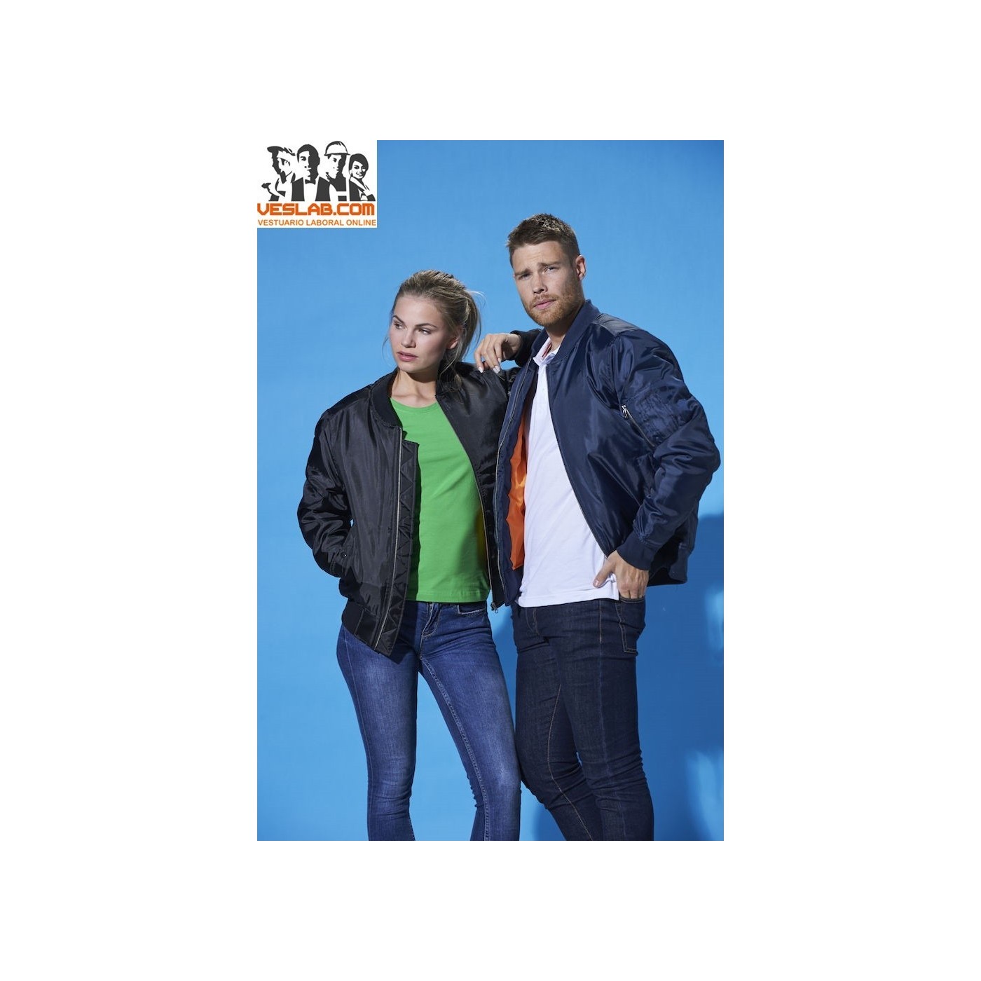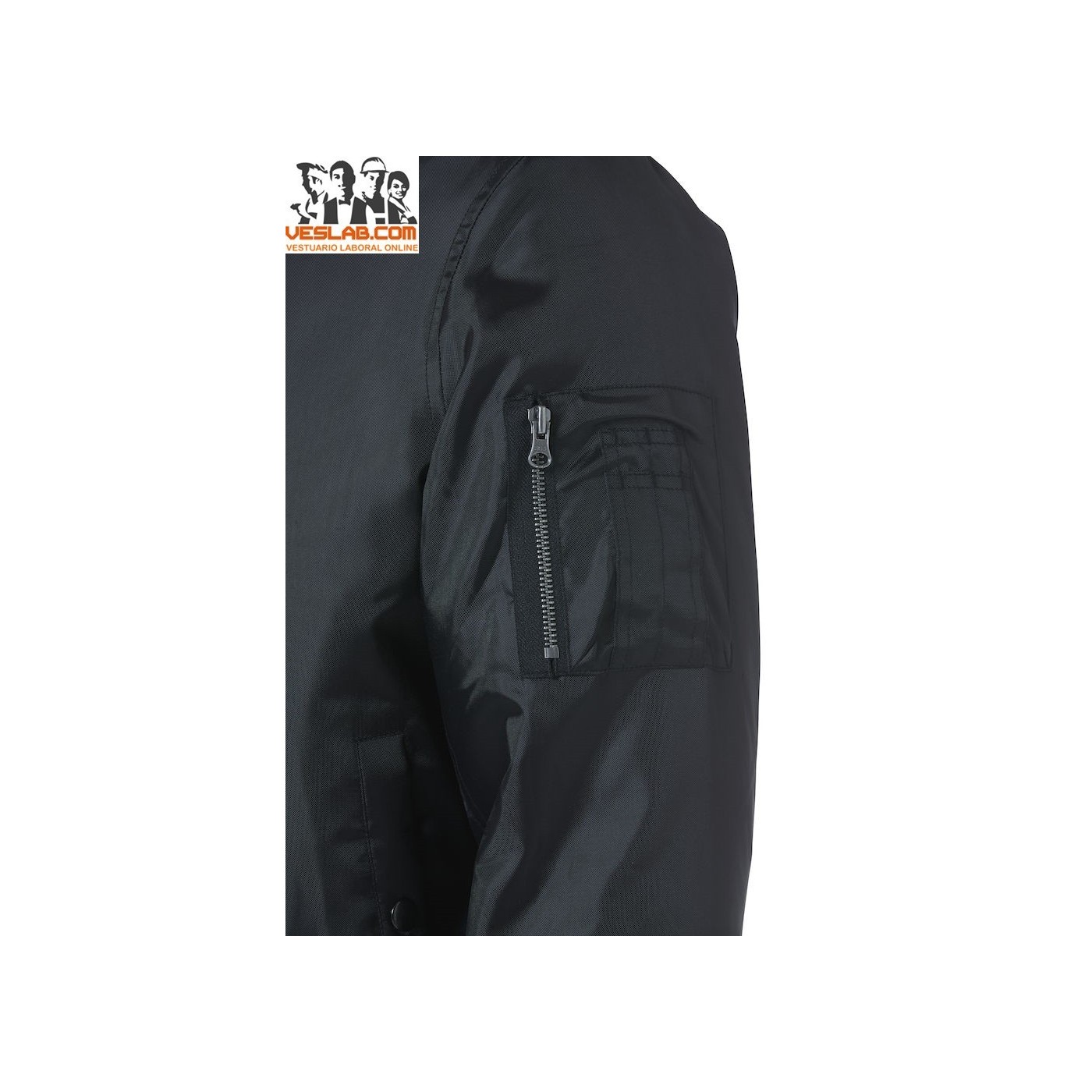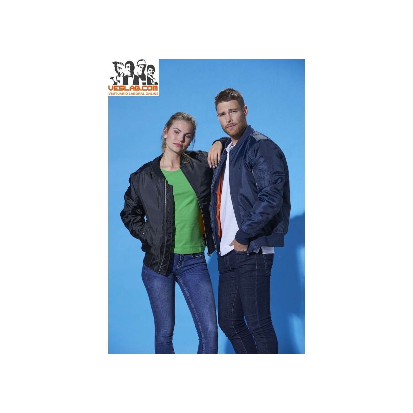 Chaqueta bomber unisex. Bolsillos laterales con botón y bolsillo en manga con cremallera. Bolsillo interior con cremallera. Cremallera SBS.